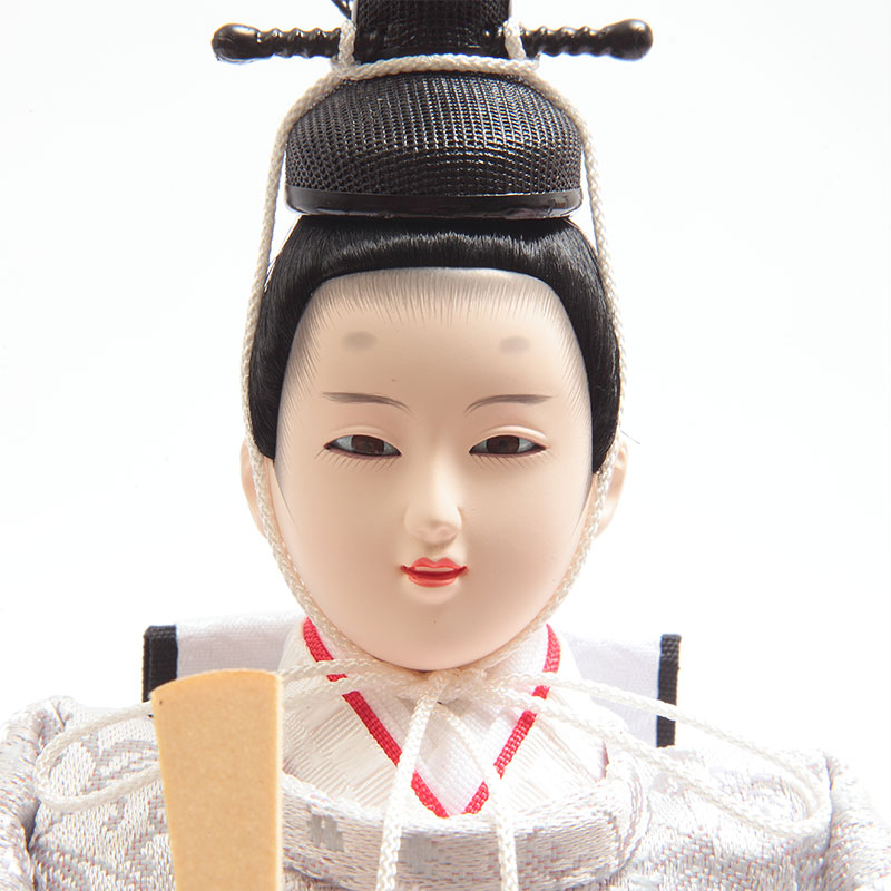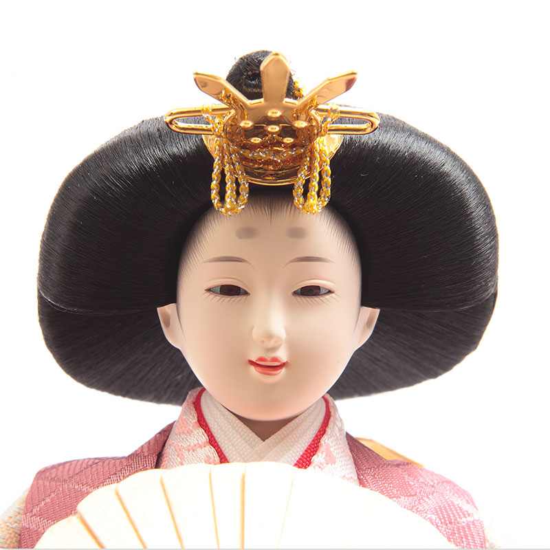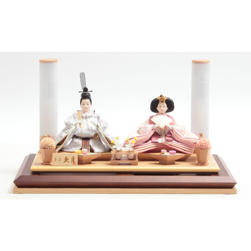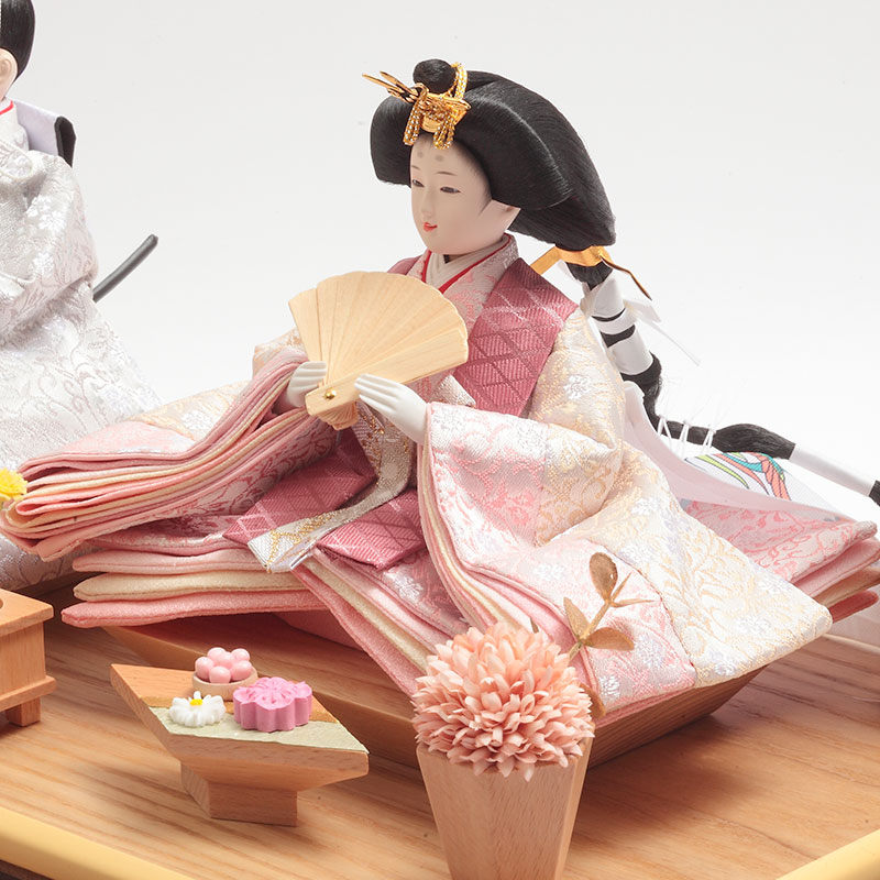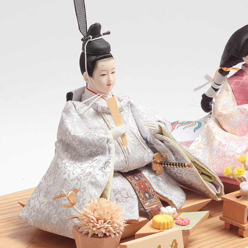 おだいり様とおひな様の衣裳を落ち着いた品のある色合いで纏め上げました。 背景に色とりどりの花を配し、全体を華やかに演出しています。 白木の明るくやわらかい雰囲気のなかに深みのあるマホガニーのラインがお洒落なケース飾りです。 お子様の幸せが末永く続くことを願って。