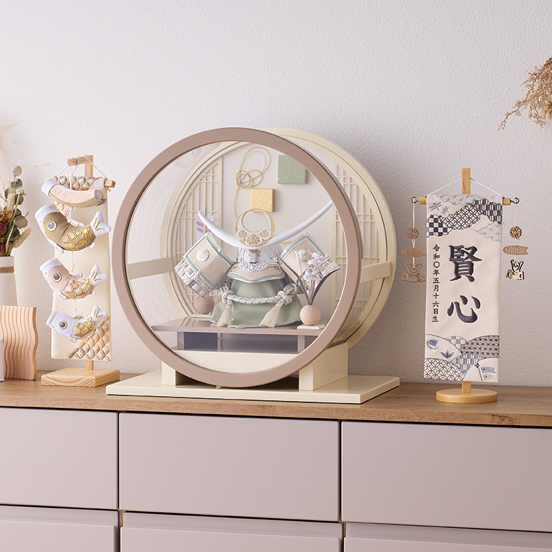 スタイリッシュな円形のアクリルケース飾りです。 上杉謙信公モデルの兜です。鍬には透かし加工を施しました。 背景には水引きを配し、縁起の良い仕上がりです。 淡い緑色を基調とし、どのようなお部屋にもお飾り頂ける兜ケース飾りです。