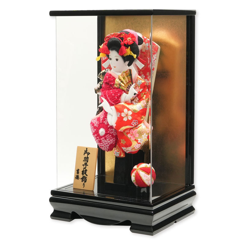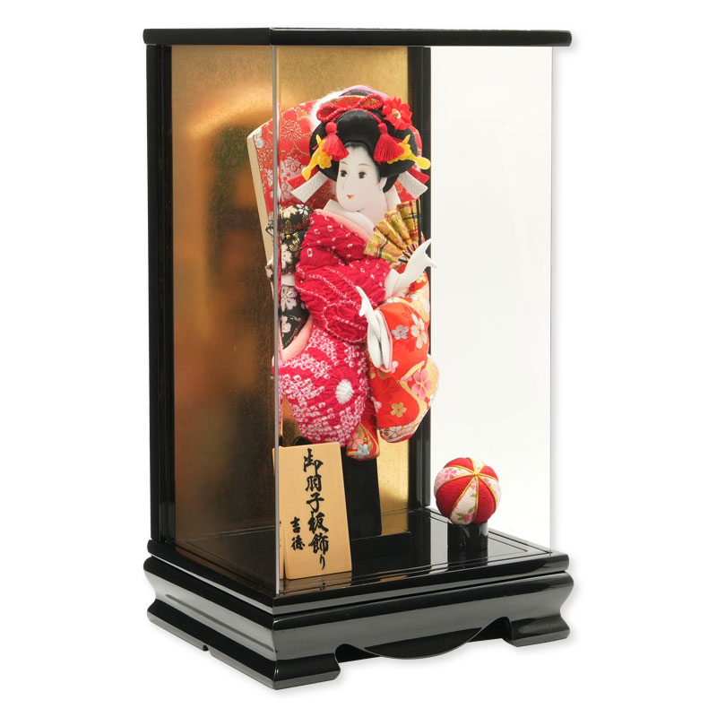 黒塗りの枠に金の背景という伝統的な組み合わせのケースを使用しました。 赤いつまみ細工を付けた可愛らしい羽子板を御殿まりの付いたケースにセットしました。 ケースは軽くて割れにくいアクリルを使用しています。 前面に柱の無いパノラマタイプなので正面からも側面からも羽子板が良く見えます。 羽子板は女の子の無病息災を祈るお守りでもあります。