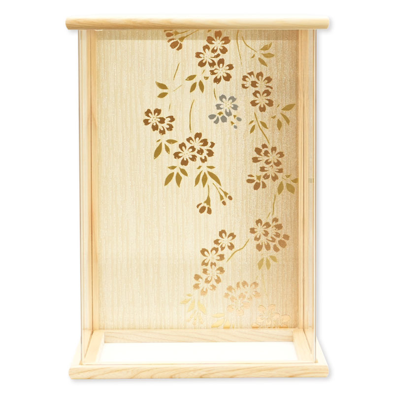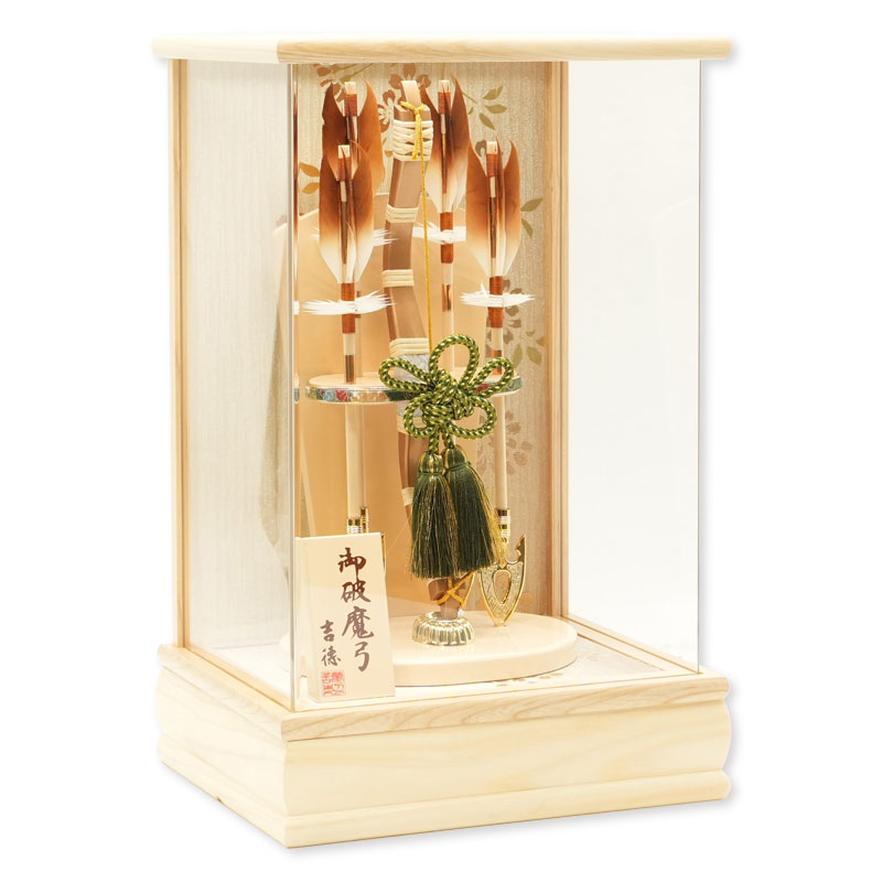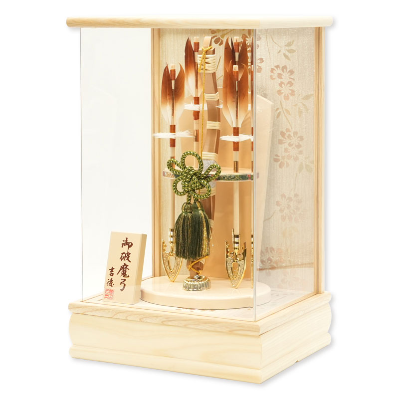 ケースと背景を白木目で統一した上品で温かみのある破魔弓ケース飾りです。 背景から底面に流れるような枝垂桜を金彩で描きました。 間口23cmのコンパクトサイズで飾る場所を選びません。 アクリルのケースを使用しています。 破魔弓は男の子の健やかな成長を祈るお守りでもあります。