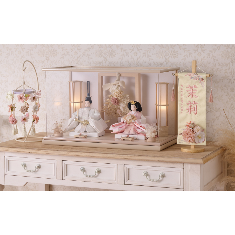 お子様のお名前と生年月日がピンク色の刺繍糸で入ります。 取り外し可能な髪飾りが付いています。 お子様だけのオンリーワン商品です。 名入れには楷書体を使用しています。ゴシック体表記の文字と一部異なる場合もありますので、予めご了承下さい。