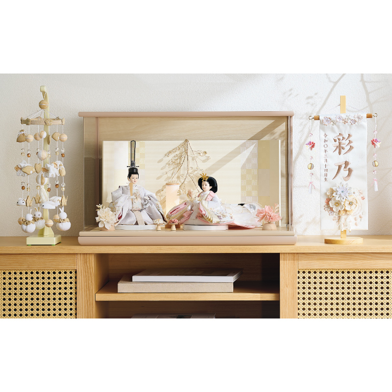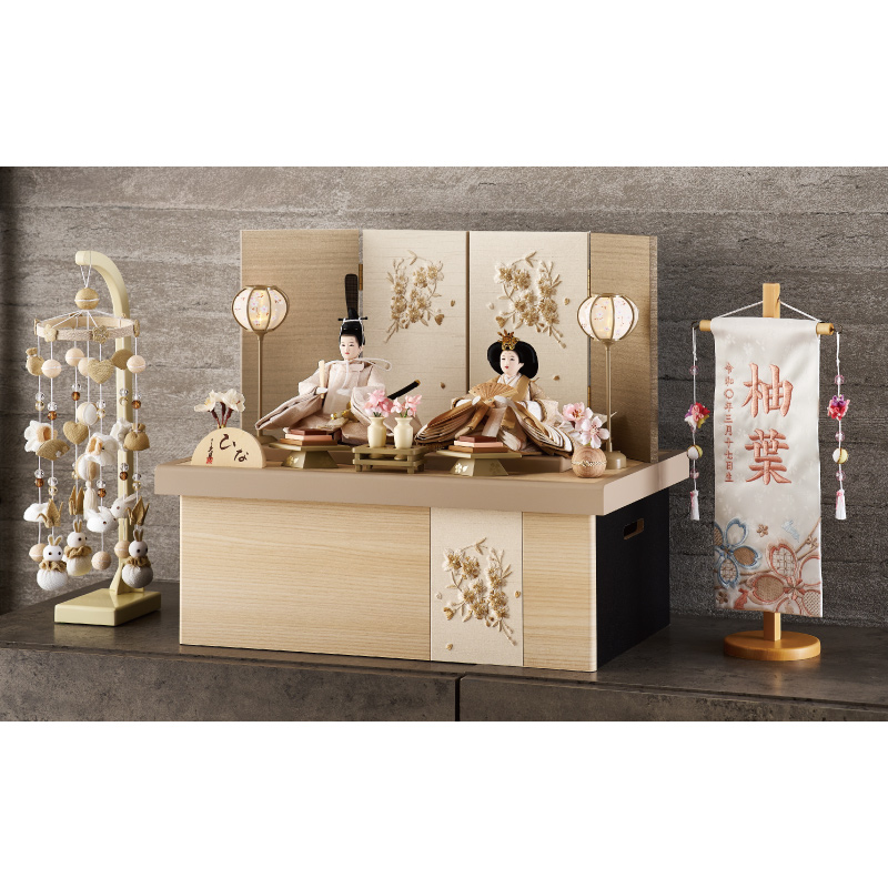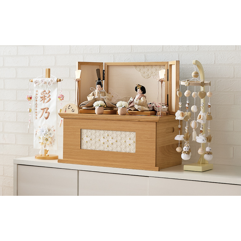 明るい色合いのクリーム色の台に、真ん中には花まり、周りにはビーズ付きのうさぎを吊るしかわいらしい雰囲気に仕上げました。 つるし飾りのお飾りにはひとつひとつ意味があり、うさぎとまりには健やかな成長の願いが込められています。 コンパクトな吊るし飾りで、親王飾りやケース飾りの隣にピッタリのサイズです。 お子様の幸せが末永く続くことを願って。
