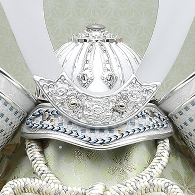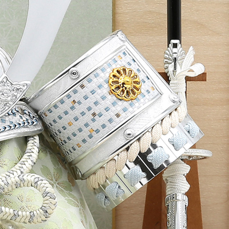シンプルな淡い水色を基調とした上品な兜です。 アクセントで背景に一枚屏風を飾り仕上げました。 明るい色合いのケースでどのような場所にも良く合います。 前面に柱の無い、開放的なケース飾りです。 軽量で扱いやすい、アクリルケース飾りです。
