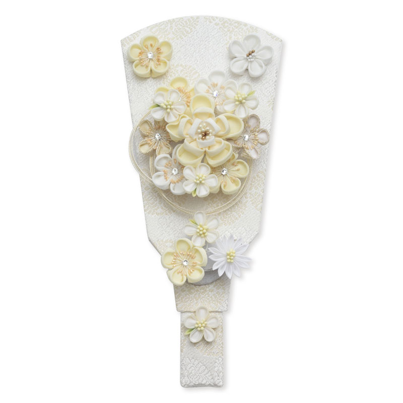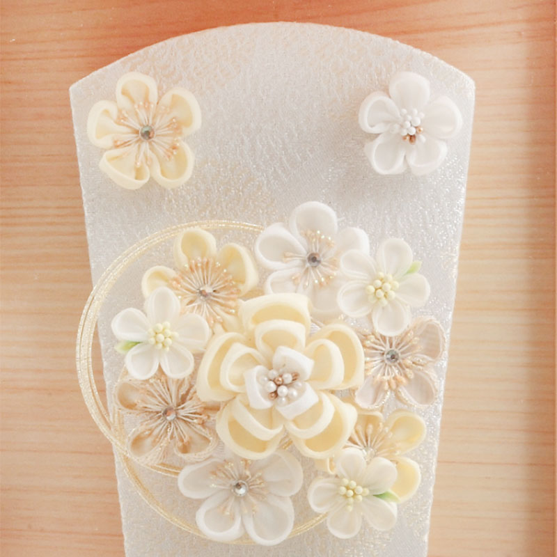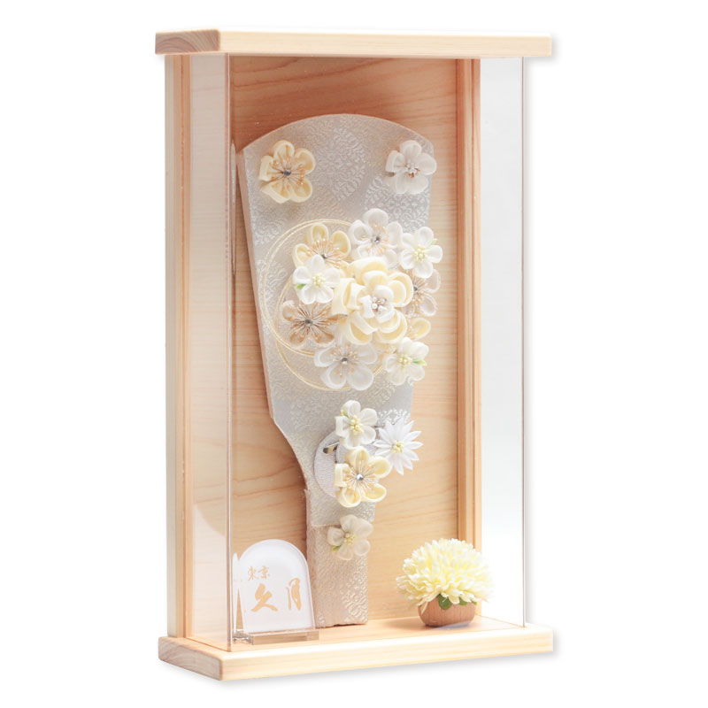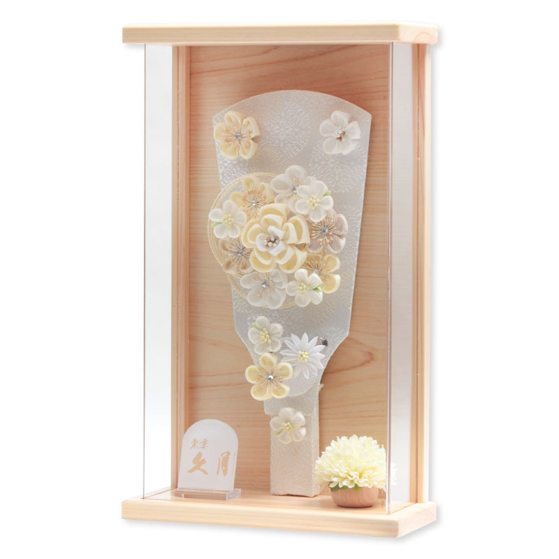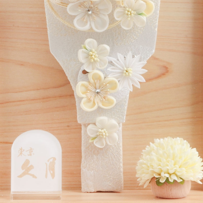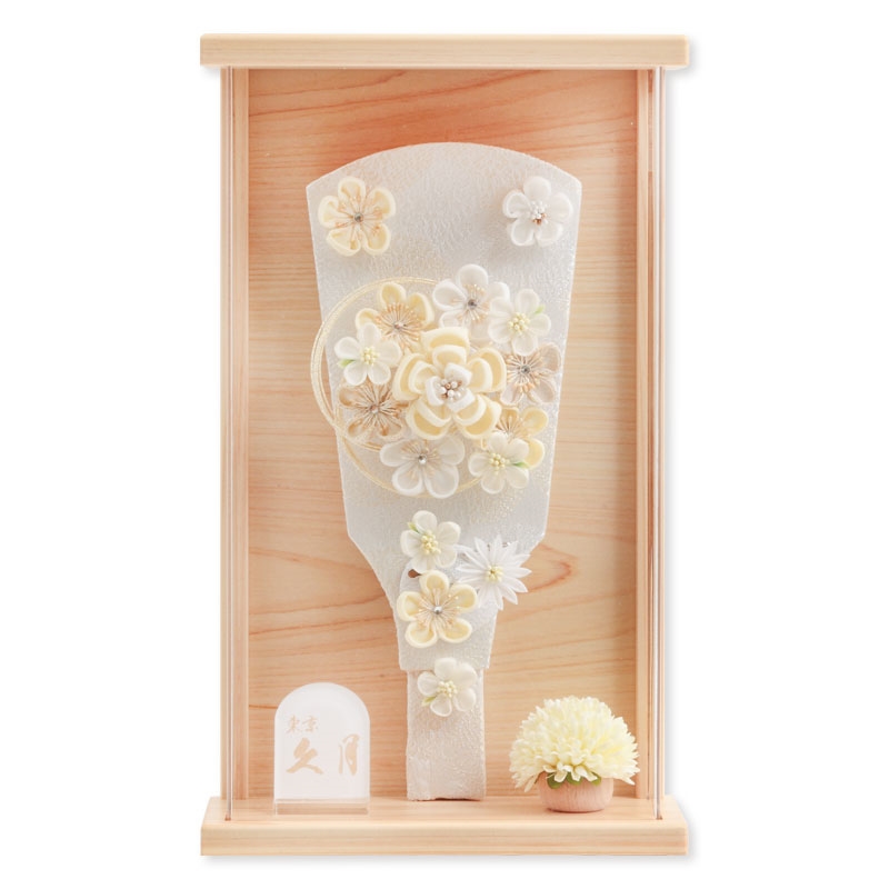 柔らかい色のつまみ細工が散りばめられた羽子板飾りです。 白を基調とした羽子板に満開に咲く花をモチーフとした華やかなイメージのつまみ細工をあしらいました。 花の飾りを外せば髪飾りになります。 桧のアクリルケースは壁掛けとしてもお飾りできます。 羽子板はケースから取り外し可能です。 お子様の幸せが末永く続くことを願って。