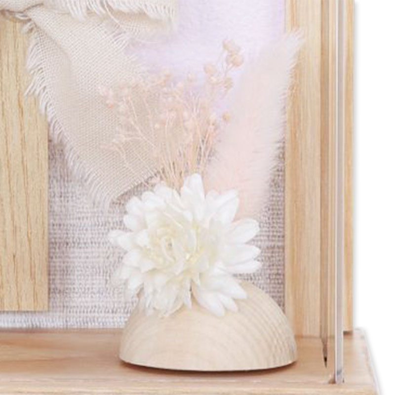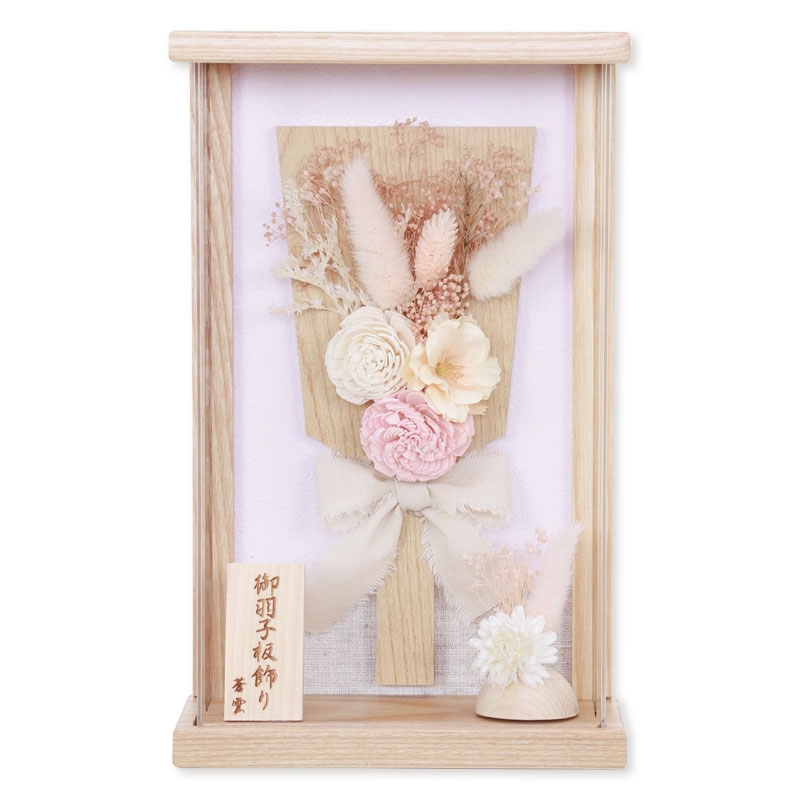 木目のケースにかわいらしい造花あしらった羽子板ケース飾りです。 コンパクトで壁掛けとしてもお飾りできます。 お正月の羽根つきは、江戸の昔から女の子の遊びです。 そして羽子板は、女の赤ちゃんの無病息災のお守りの意味も持っています。 羽子板でつく羽の玉、あの黒くて堅い玉は“むくろじ”という大木の種ですが、これは漢字で”無患子”と書きます。 ”子供が患わない”という意味が込められています。