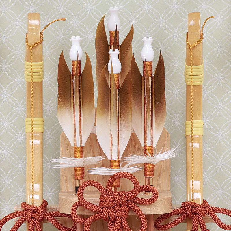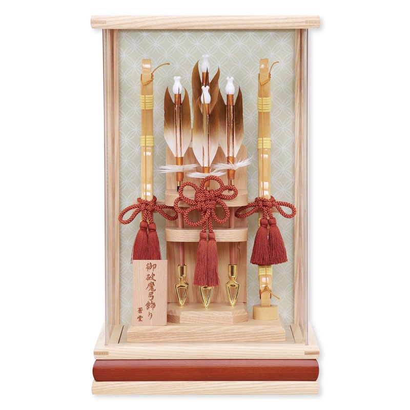 木目とブラウン色のケースに、縁起の良い七宝柄を配した破魔弓ケース飾りです。 コンパクトながら勇ましさが感じられます。 破魔弓とは、読んで字のごとく、弓で魔を破るという意味がありますが、これと関わりが深いものに、平安時代から伝わる鳴弦(めいげん)の儀があります。 これは弓の弦を強く弾き鳴らすことによって、魔除け・邪気払いをするという大変意味深い儀式です。 縁起物として伝えられてきた弓と矢を組み合わせたものが、現代の破魔弓の基になっているのです。