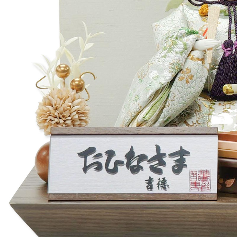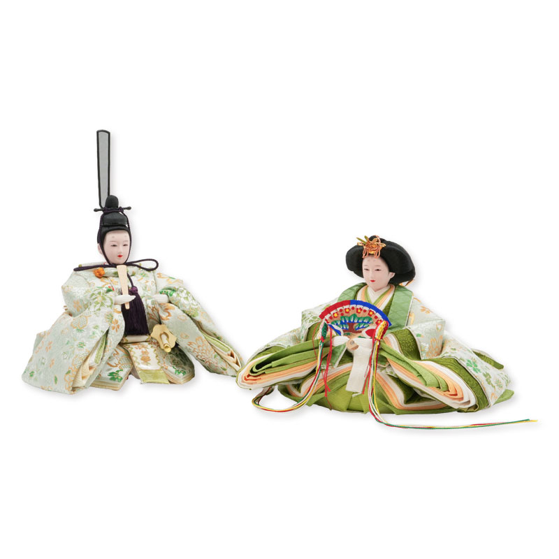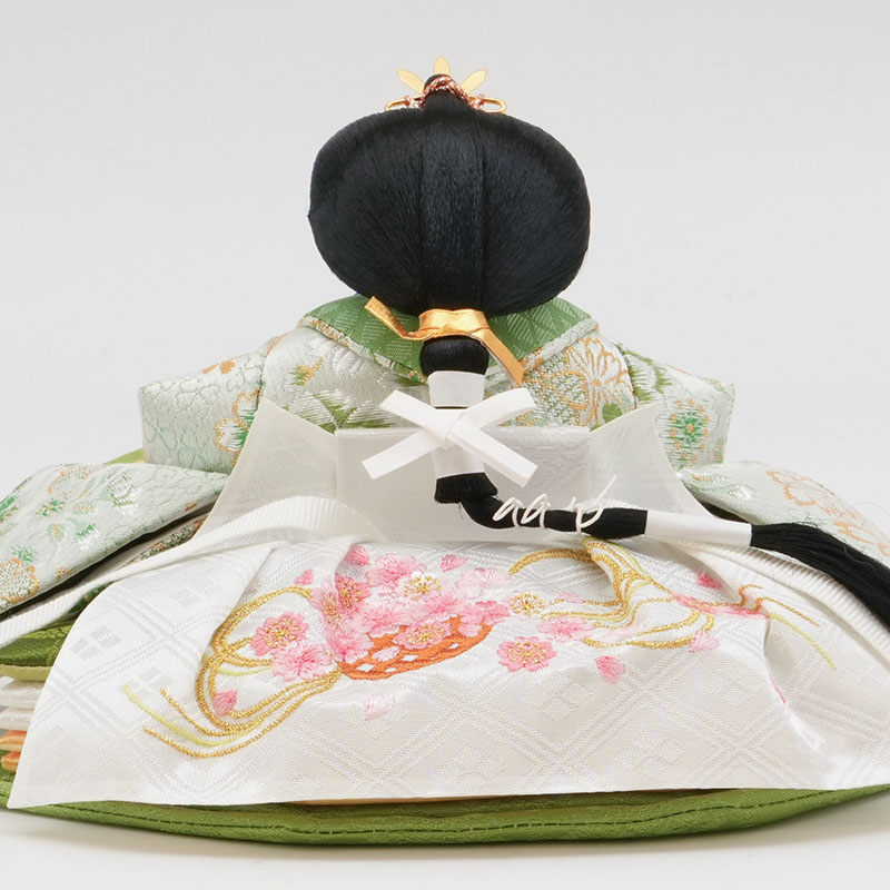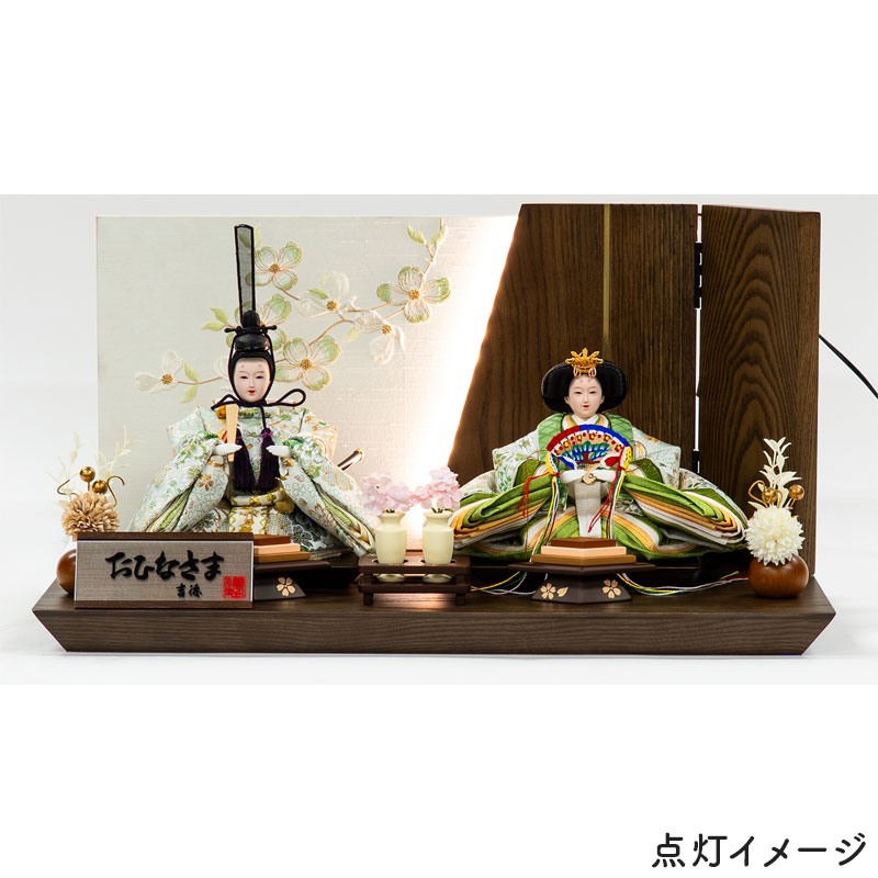 グリーンの衣裳のお人形と茶木目の台屏風がマッチした上品な親王飾りです。 お人形の衣裳には八重桜を織り出した生地を用いました。 ハナミズキの刺繍を施した屏風にはLED照明を配しました。 お人形を優しく照らします。 雛人形は、女の子の誕生を祝うとともに、その健やかな成長を祈って飾るお人形です。 ※商品の画像は実際の商品と一部異なる場合がございますのでご了承ください。