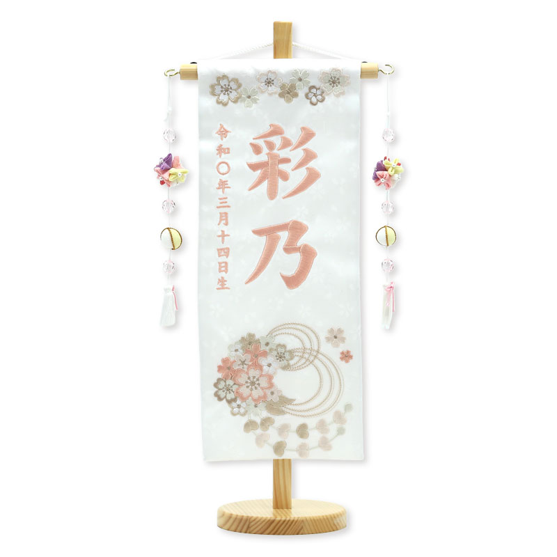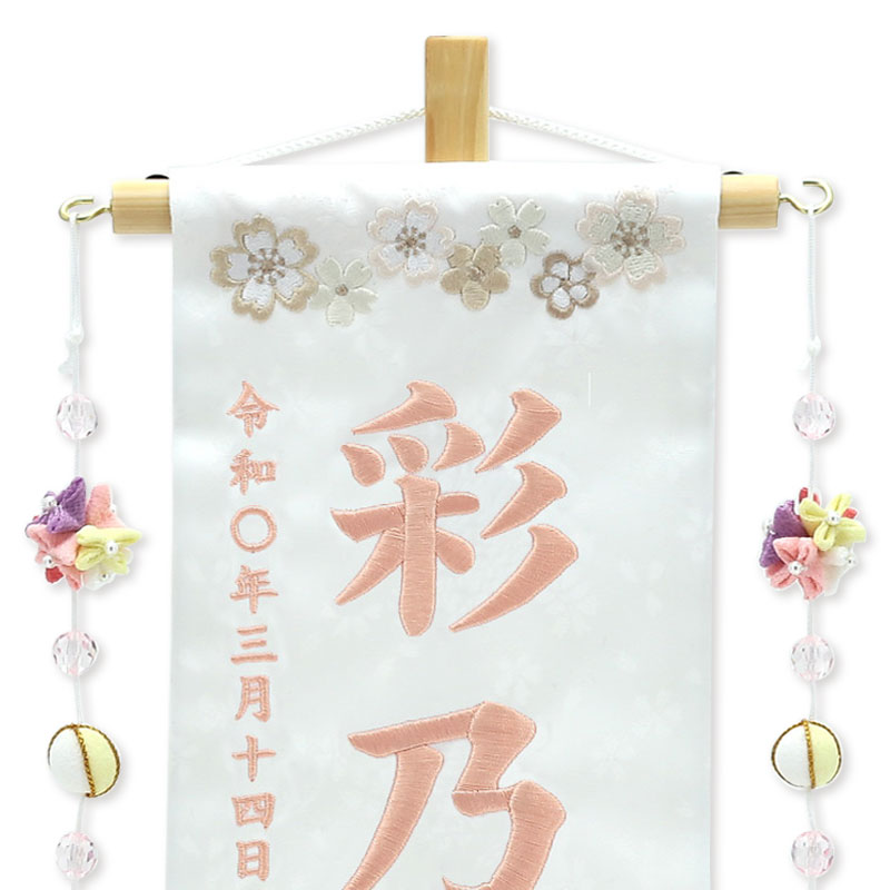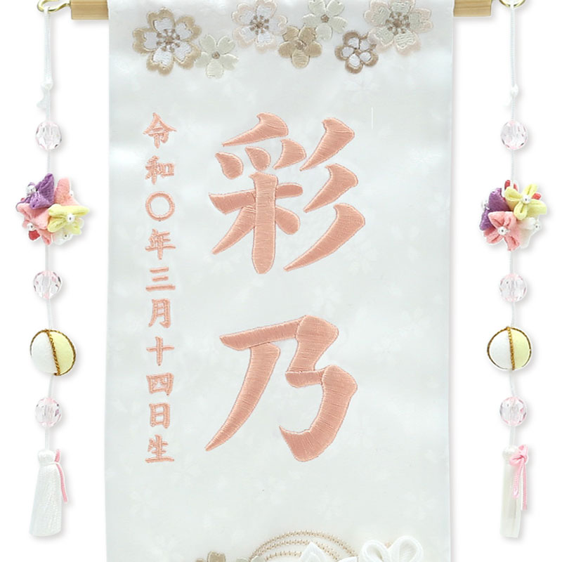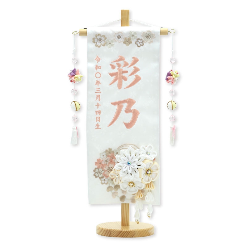 【刺繍糸変更商品】刺繍糸の色は「サーモンピンク」です。 お子様のお名前と生年月日が入ります。 取り外し可能な髪飾りが付いています。 お子様だけのオンリーワン商品です。 名入れには楷書体を使用しています。 ゴシック体表記の文字と一部異なる場合もありますので、予めご了承下さい。