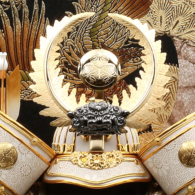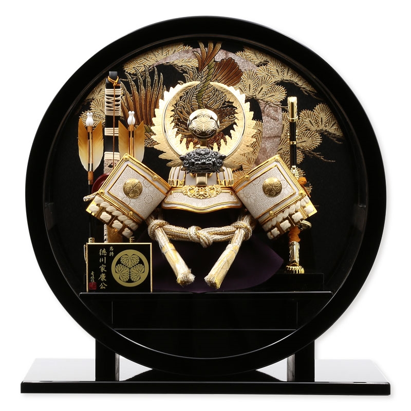 高級な黒塗りの円型ケースに徳川家康の兜で鷹を背景に勇ましいケース飾りに仕上げました。
