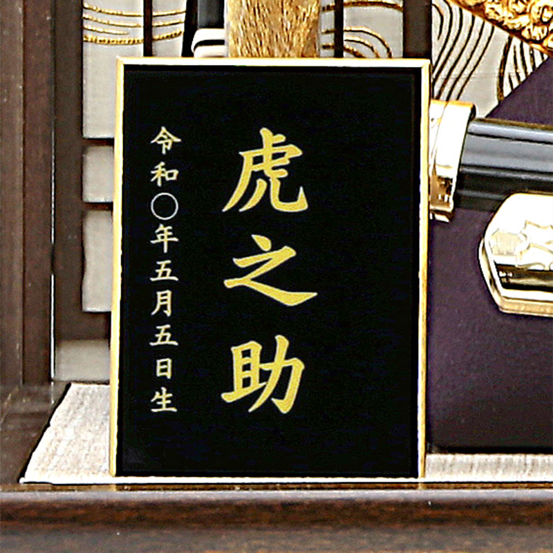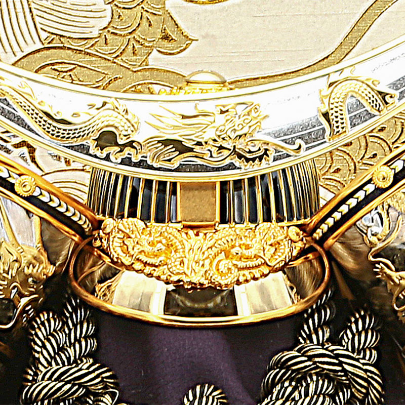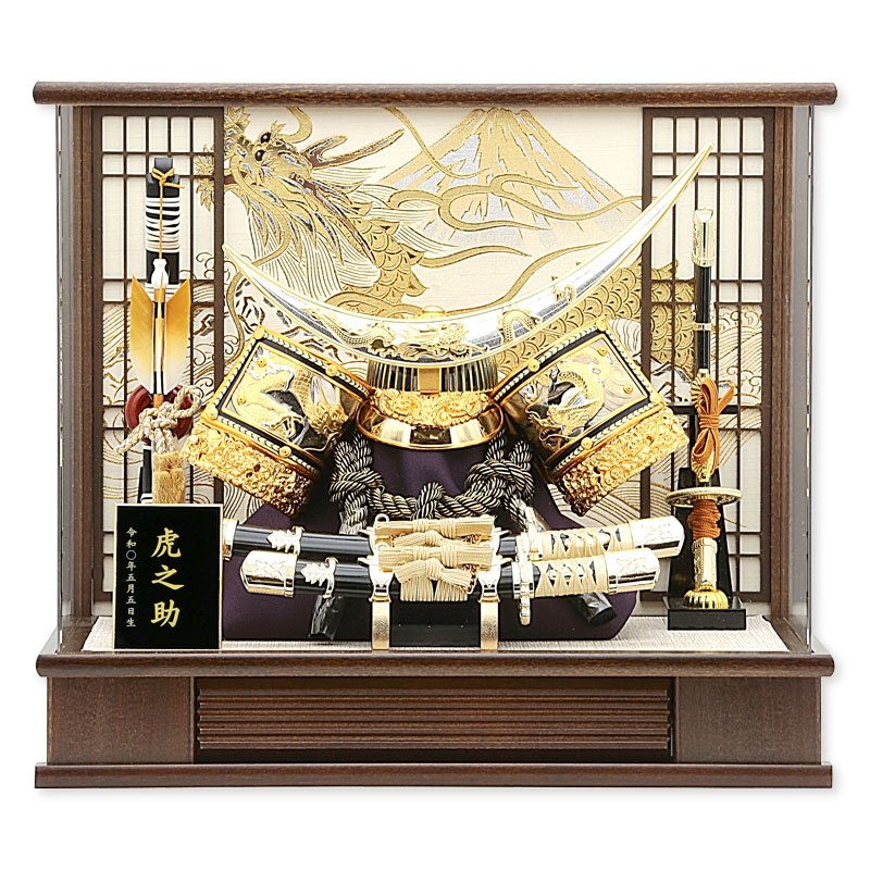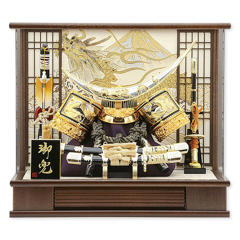 香木の色のケースに彫金の兜で豪華な仕様です。 背景の格子とケースの色を合わせて龍と富士山で勇ましい飾りに仕上げました。