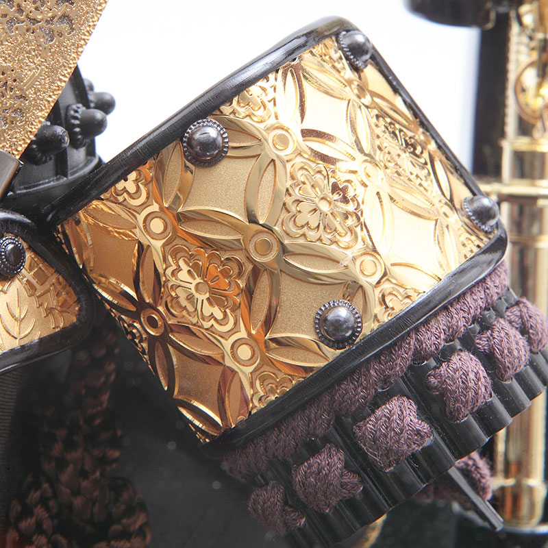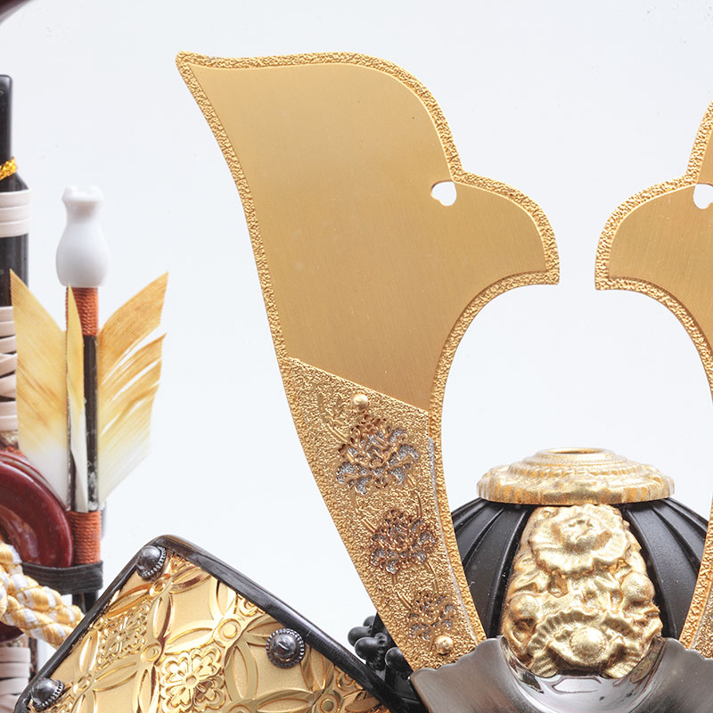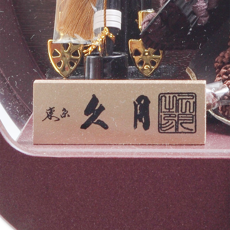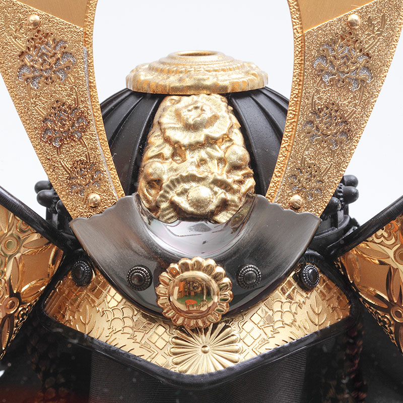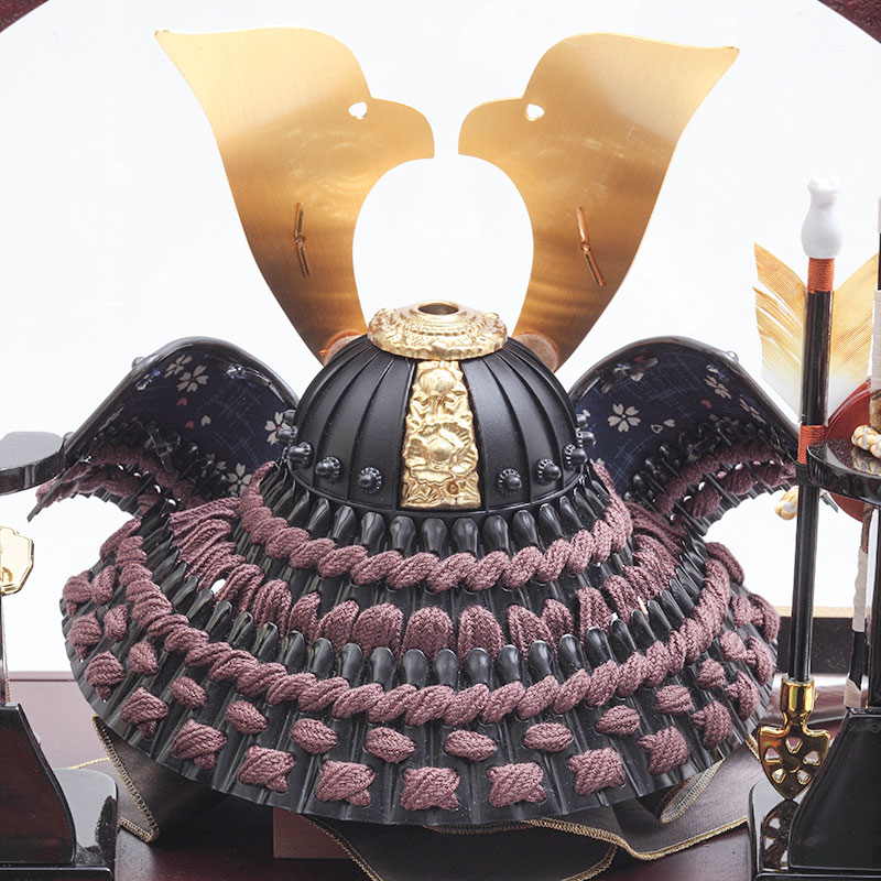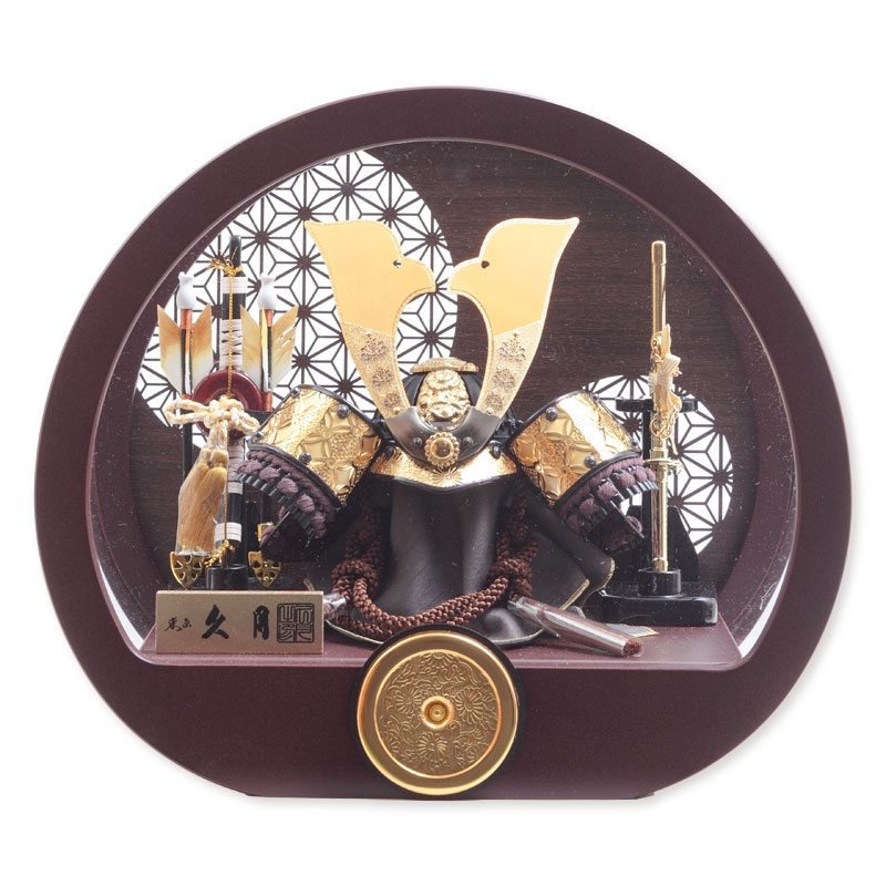 コンパクトなブラウンの円形ケースの背景に麻の葉模様を透かし彫りで描きました。 背景の麻の葉柄の透かし彫りがモダンな雰囲気を醸し出しています。 兜吹き返しに施された七宝柄の金具と鉢と鍬形にある牡丹柄の金具が目を引く兜を配しました。 ケース幕板前面の金具には323種類の中からお選び頂ける家紋を付けることが出来ます。 (申込書在中)兜には煌びやかな七宝柄と牡丹柄の金具を配しました。 円形ケースにより様々な角度から兜をお楽しみいただけます。お子様の幸せが末永く続くことを願って。