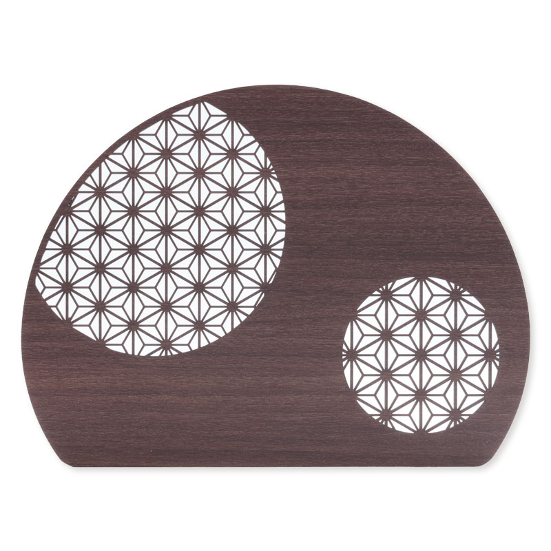 コンパクトなブラウンの円形ケースの背景に麻の葉文様を透かし彫りで描きました。