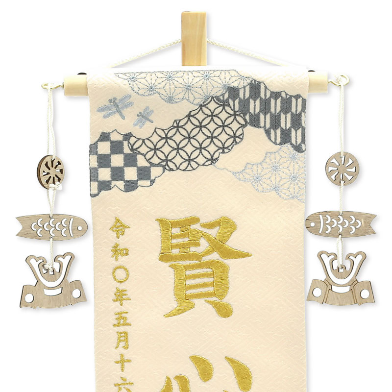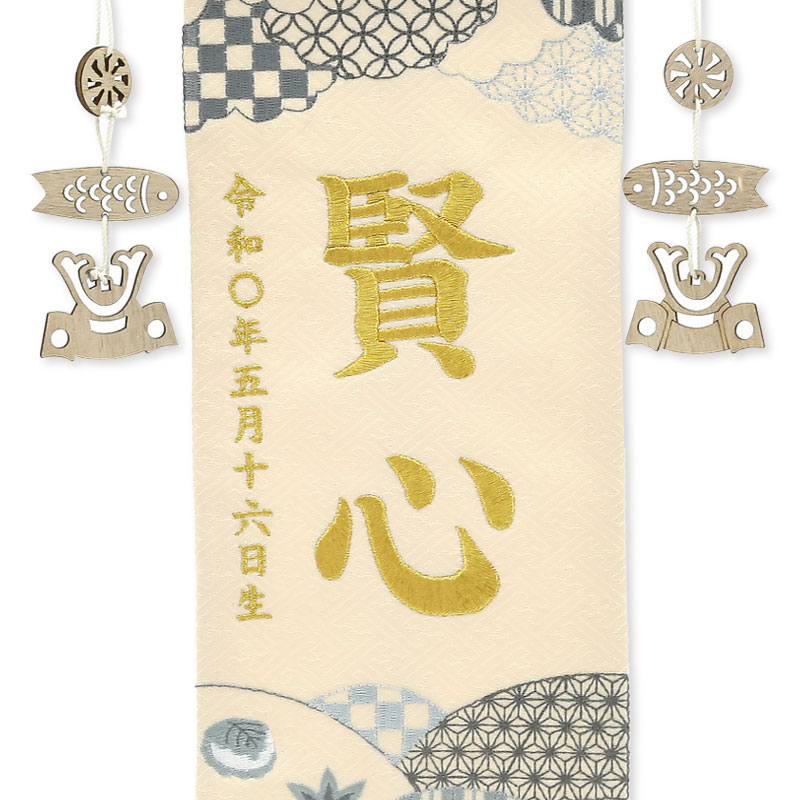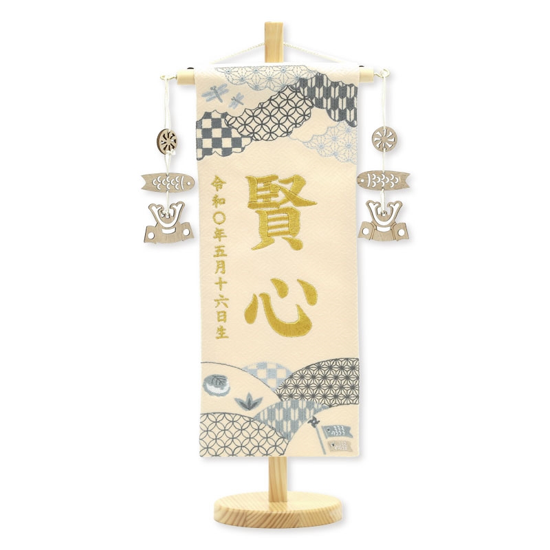 【刺繍糸変更商品】刺繍糸の色は「ゴールド」です。 刺繍糸色変更なし商品:95090M(JANコード:4562338687613) 白木の飾り台にベージュを基調とした明るい雰囲気の名前旗です。 お子様のお名前、生年月日が刺繍で入ります。 兜飾りと一緒にお飾り頂けます。 お子様だけのオンリーワン商品です。 名入れには楷書体を使用しています。 ゴシック体とは表現が異なる場合がございますので予めご了承下さい。