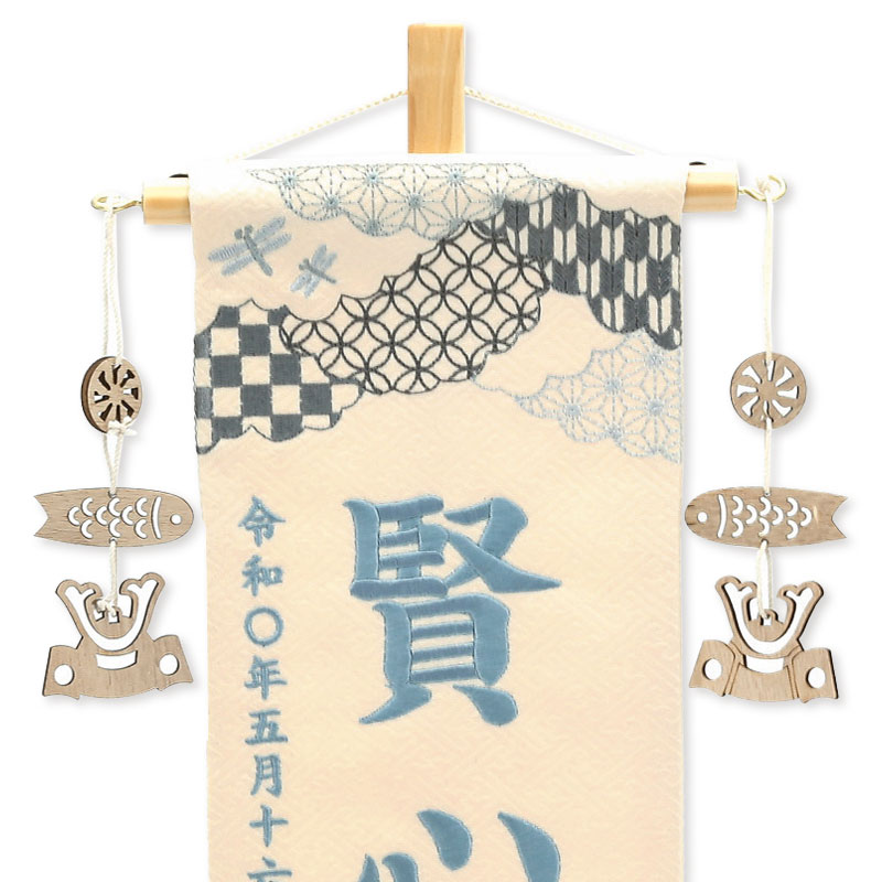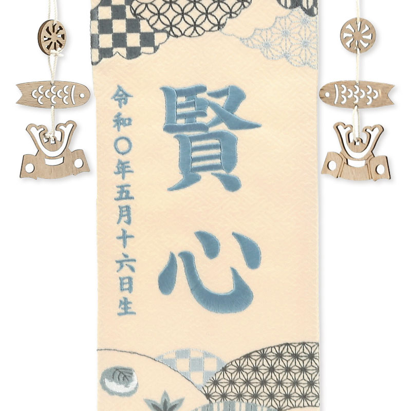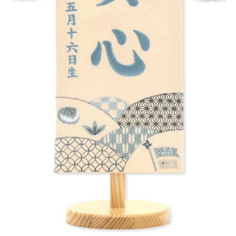 【刺繍糸変更商品】刺繍糸の色は「ライトブルー」です。 刺繍糸色変更なし商品:95090M(JANコード:4562338687613) 白木の飾り台にベージュを基調とした明るい雰囲気の名前旗です。 お子様のお名前、生年月日が刺繍で入ります。 兜飾りと一緒にお飾り頂けます。 お子様だけのオンリーワン商品です。 名入れには楷書体を使用しています。 ゴシック体とは表現が異なる場合がございますので予めご了承下さい。
