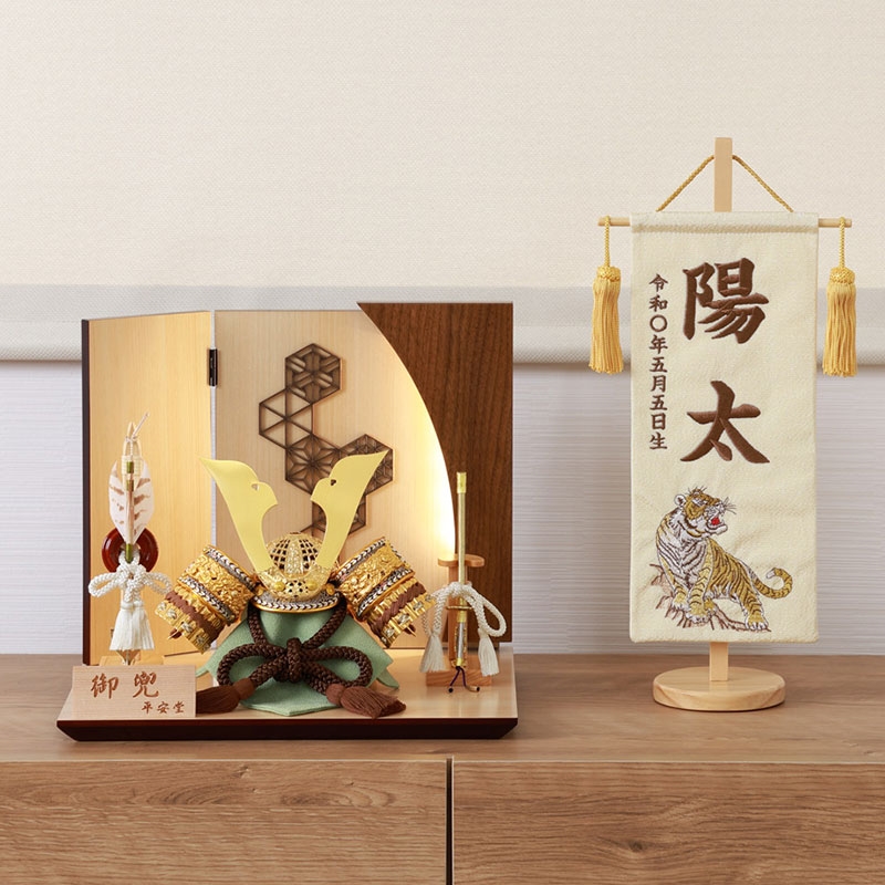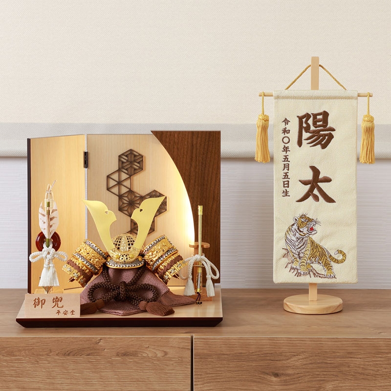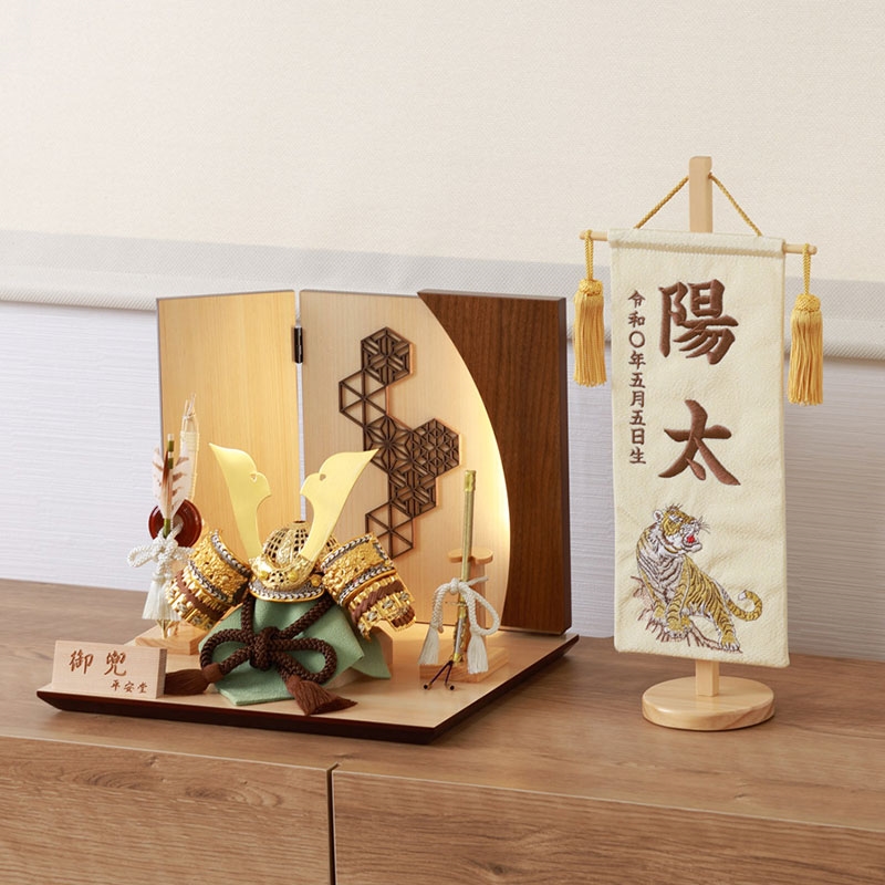 木目調屏風にLED照明をあしらい、ナチュラルな縅し糸の兜に金色の前立てが華やかに映えます。 組子細工の模様をあしらった木目調の屏風にはLED照明が付いており、温かみのある光で兜を引き立てます。 ナチュラルカラーの縅し糸で仕立てられた兜は、金色の前立てが華やかに輝きます。 五月人形を飾る端午の節句は、家庭で行う小さなお祭りです。 生まれてきた男の子に対する、周りの人たちのあたたかな思いをかたちにしたもの。 誕生をこころから喜び、健やかな成長と将来の幸せを願う愛情のかたちそのものなのです。