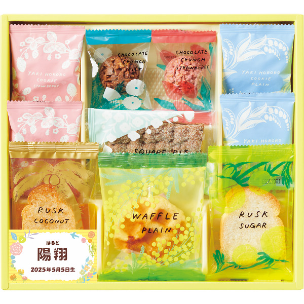 ●焼きほろろクッキー×4(プレーン・いちご×各2)、スクエアパイ(ショコラ)×1、ワッフル(プレーン)×1、ラスク×2(シュガー・ココナッツ×各1)、チョコレートクランチ×2(ミルク・いちご×各1) ●箱サイズ:26.3×24×3.5cm ●名入れ ※賞味期限は製造・加工日を基準に表記しております。お届け時の期限が配送状況等により異なりますので、あらかじめご了承ください。 ※賞味期限が表記されていない商品の賞味期限は91日以上です。
