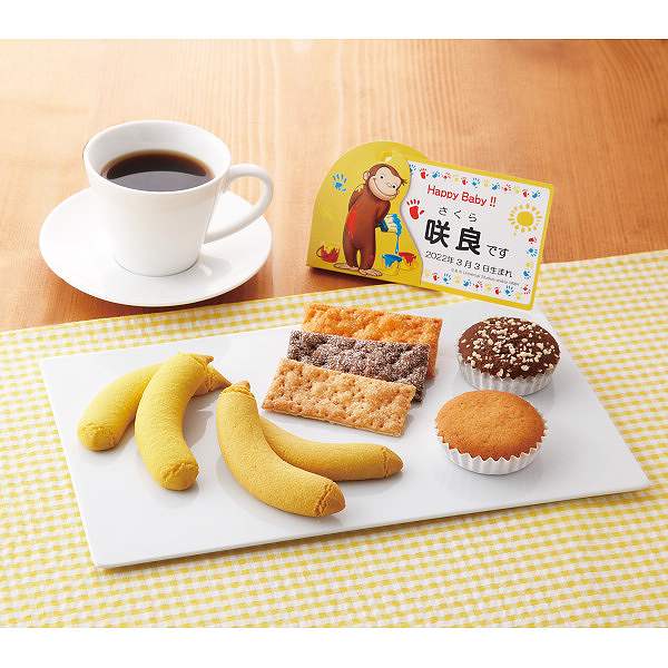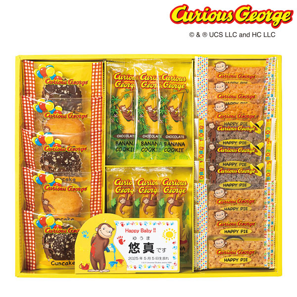 絵本やテレビで人気のおさるのジョージのギフトセット。かわいらしいデザインに囲まれたジョージがスイーツをお届け。
