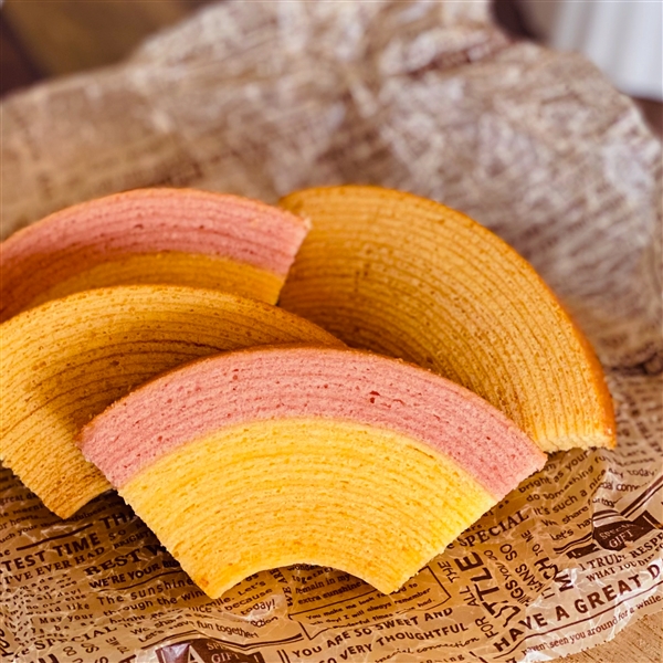 おめでたい末広がり型のカットバームクーヘンの詰合せ。パッケージにお名入れをしてのお届けです。
