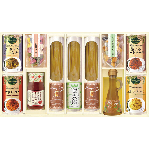 ●スパゲティ(200g)×3、自然色パスタ(ファルファーレ40g)×1、自然色パスタ(コンキリエ60g)×1、パスタソース(ナポリタン・カルボナーラ・黒トリュフのクリームソース・茄子のミートソース)140g×各1、エクストラバージンオリーブオイル120g×1、オーガニックとまとケチャップ300g×1 ●箱サイズ:53.2×33×8cm ●名入れ ※賞味期限は製造・加工日を基準に表記しております。お届け時の期限が配送状況等により異なりますので、あらかじめご了承ください。 ※賞味期限が表記されていない商品の賞味期限は91日以上です。