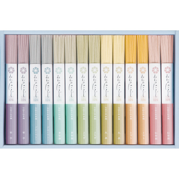 独特のコシと、のど越しが自慢の手延べ素麺を三輪の虹に見立てた彩り豊かな七色の素麺に仕上げ、昔ながらの製法により一束ずつ線香巻きで包装いたしました。 お子様のお名前とお誕生日を入れることができます。 お世話になったあのお方にお子様のお名前をお披露目するのにピッタリ。
