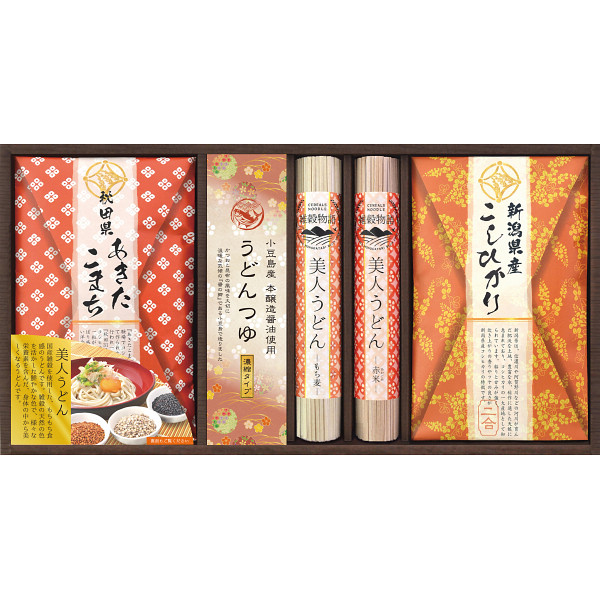 ●新潟県産こしひかり2合(300g)×1、秋田県産あきたこまち2合(300g)×1、美人うどんもち麦(1人前)85g×1、美人うどん赤米(1人前)85g×1、めんつゆ20ml×3 ●箱サイズ:39.5×21×5.5cm ●名入れ ※アレルギー物質を含む特定原材料8品目について明記しております。 ※賞味期限が表記されていない商品の賞味期限は91日以上です。 ※賞味期限は製造・加工日を基準に表記しております。お届け時の期限が配送状況等により異なりますので、あらかじめご了承ください。
