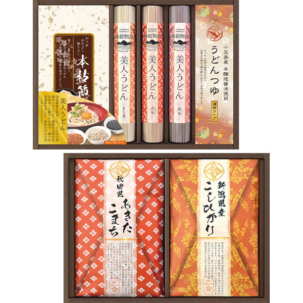 ●新潟県産こしひかり2合(300g)×1、秋田県産あきたこまち2合(300g)×1、美人うどんもち麦(1人前)85g×1、美人うどん赤米(1人前)85g×1、美人うどん黒米(1人前)85g×1、本枯節2g×3、めんつゆ20ml×3 ●箱サイズ:29.3×22×11cm ●名入れ ※アレルギー物質を含む特定原材料8品目について明記しております。 ※賞味期限が表記されていない商品の賞味期限は91日以上です。 ※賞味期限は製造・加工日を基準に表記しております。お届け時の期限が配送状況等により異なりますので、あらかじめご了承ください。