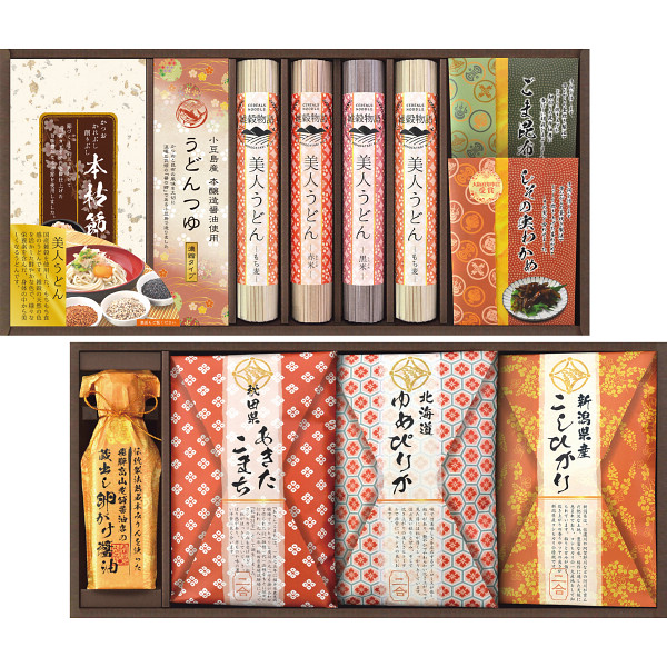 ●新潟県産こしひかり2合(300g)×1、秋田県産あきたこまち2合(300g)×1、北海道産ゆめぴりか2合(300g)×1、美人うどんもち麦(1人前)85g×2、美人うどん赤米(1人前)85g×1、美人うどん黒米(1人前)85g×1、蔵出し卵がけ醤油120ml×1、本枯節2g×3、ごま昆布佃煮40g×1、しその実わかめ佃煮45g×1、めんつゆ20ml×4 ●箱サイズ:43×22×11cm ●名入れ ※アレルギー物質を含む特定原材料8品目について明記しております。 ※賞味期限が表記されていない商品の賞味期限は91日以上です。 ※賞味期限は製造・加工日を基準に表記しております。お届け時の期限が配送状況等により異なりますので、あらかじめご了承ください。
