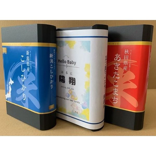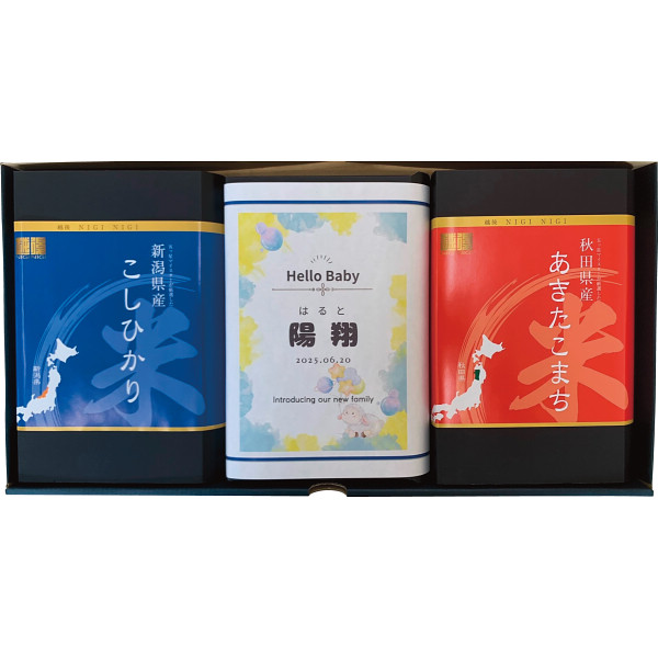 ●新潟県産コシヒカリ450g、秋田県産あきたこまち450g、五つ星マイスターブレンド米450g ●箱サイズ:22.5×43.5×5cm ●名入れ ※アレルギー物質を含む特定原材料8品目について明記しております。 ※賞味期限が表記されていない商品の賞味期限は91日以上です。 ※賞味期限は製造・加工日を基準に表記しております。お届け時の期限が配送状況等により異なりますので、あらかじめご了承ください。