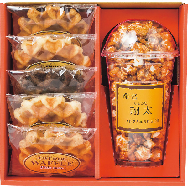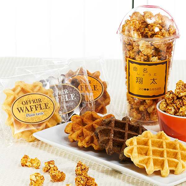 ●塩キャラメルポップコーン、ベルギーワッフル(プレーン)×2、ベルギーワッフル(メープル)×2、ベルギーワッフル(チョコ) ●箱サイズ:23.4×24×10.5cm ●賞味期限:常温で30日 ●名入れ ※アレルギー物質を含む特定原材料8品目について明記しております。 ※賞味期限は製造・加工日を基準に表記しております。お届け時の期限が配送状況等により異なりますので、あらかじめご了承ください。