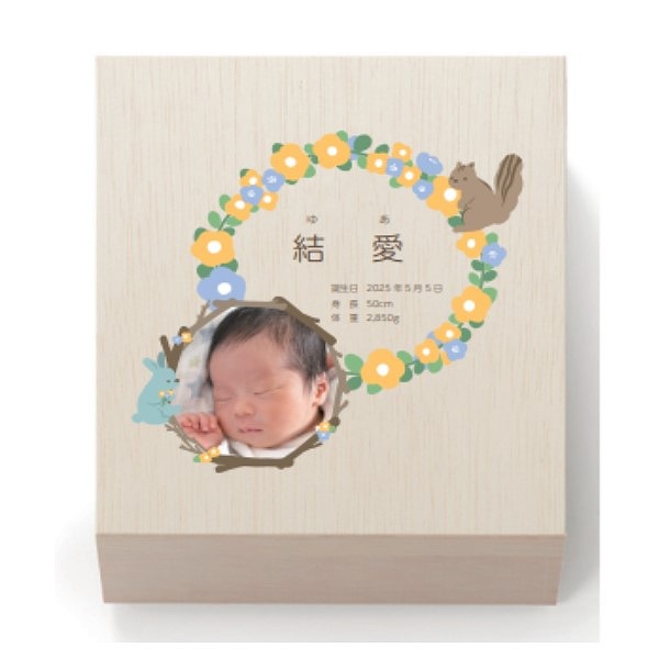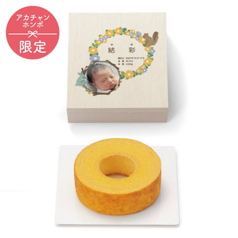 赤ちゃんの写真を木箱のフタにプリント。北海道産生乳100%の生クリーム使用やさしい甘さのバウムクーヘンとともに、感謝を伝えるギフトです。
