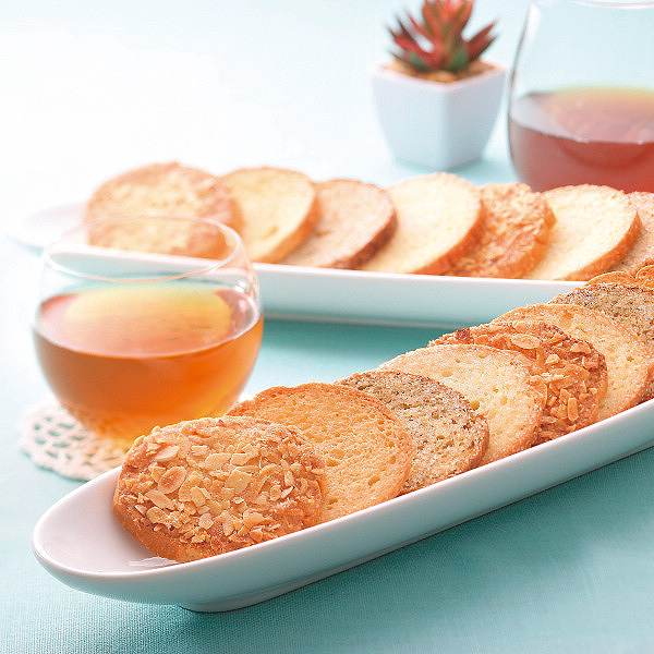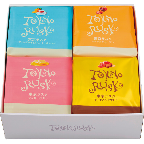 定番のシュガーバター、人気のキャラメルアマンド、甘さ控えめのメープル、さわやかなアールグレイの4種の味のラスクの詰め合わせです。職場へのお土産やちょっとしたパーティーにもご利用いただけます。