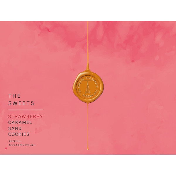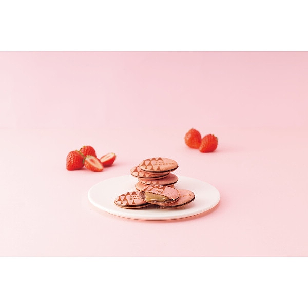 あまおう苺のフリーズドライを混ぜた濃厚なラングドシャ生地でキャラメルとチョコレートをサンドしました。