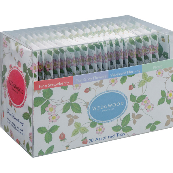 ウェッジウッドの代表柄「ワイルドストロベリー」のかわいらしいパッケージに入った4種類のアソートティーバッグ。その日の気分に合わせて楽しめ、ちょっとしたお返しや手土産に喜ばれるひと品です。