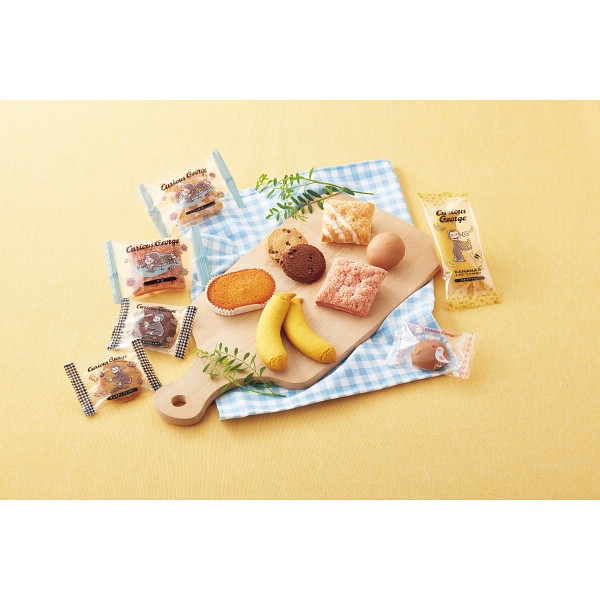絵本やテレビアニメで人気の「おさるのジョージ」がギフト商品になって新発売。 かわいらしいジョージがお菓子を詰め合わせたスイーツギフトセットと一緒にお届けします。