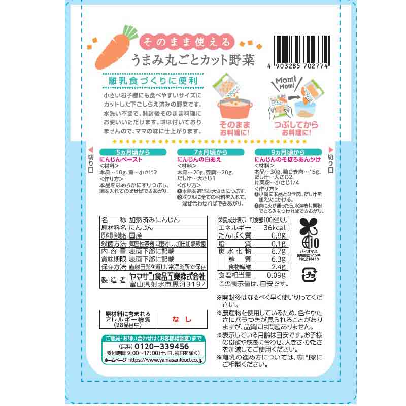 ●内容量:50g ●対象月齢:つぶして5か月頃から・そのままで9か月頃から ●原材料名:にんじん ●殺菌方法:気密性容器に密封し、加圧加熱殺菌