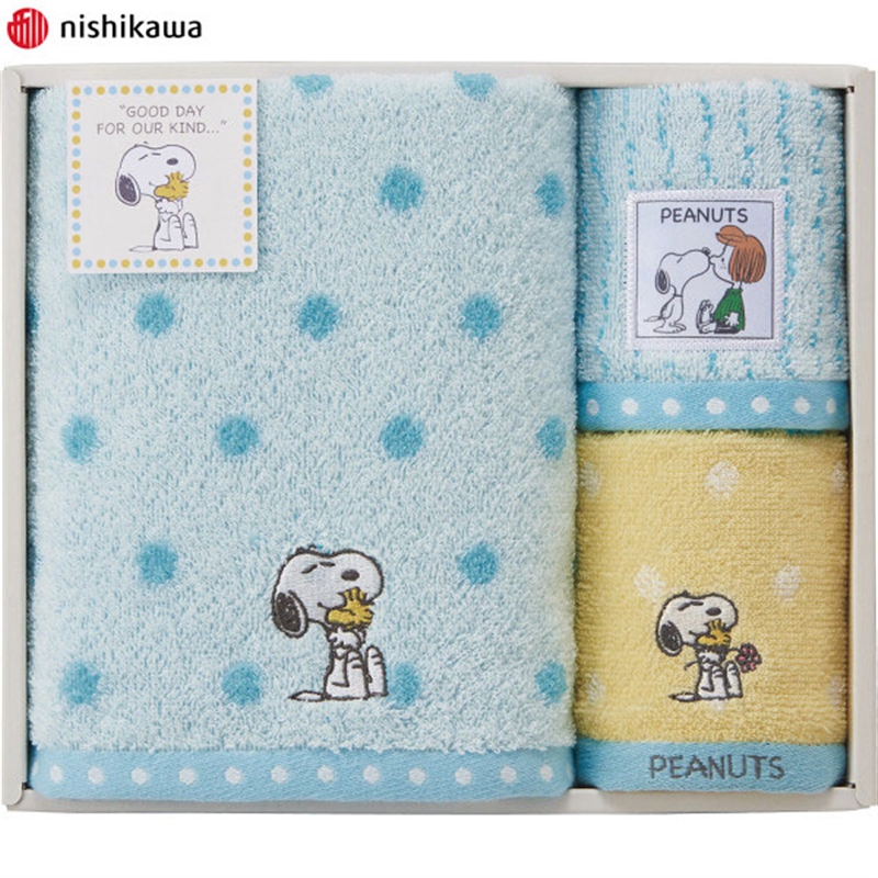 PEANUTSからハグをテーマに、スヌーピーが仲間に寄り添うシーンをモチーフにしました。 ハグするスヌーピーから優しさや思いやりが伝わるデザインです。 ドットとストライプのシンプルなパターンは子どもから大人まで使いやすく、内祝いにおすすめです。