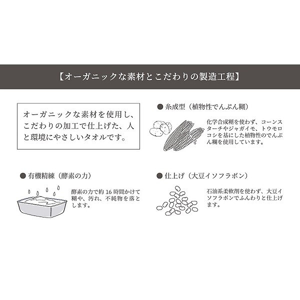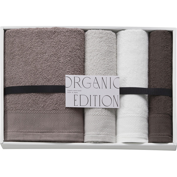 ●バスタオル(約60×110cm)・ウォッシュタオル(約29×29cm)各1枚・フェイスタオル(約29×75cm)×2枚 ●綿100%(パイル部=オーガニックコットン使用) ●箱サイズ:35×24.5×5cm ●日本製