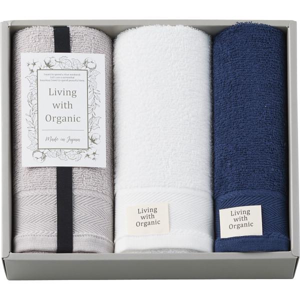 ●フェイスタオル(約29×75cm)×2枚・ウォッシュタオル(約29×29cm)×1枚 ●綿100%(パイル部=オーガニックコットン使用) ●箱サイズ:28.7×23.6×5cm ●日本製