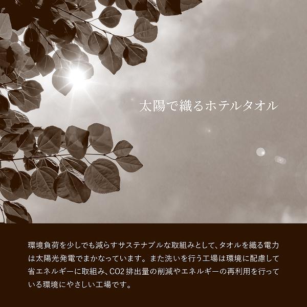 最高級ホテルが認めた高い品質基準のホテルタオルをギフトで贈ります。 長年にわたり最高級ホテルのタオルをつくってきた正岡タオルの技術力が作り上げた厚みたっぷりでボリューム感のあるホテル仕様タオルで、肌触りはとてもやわらかいのに丈夫な質感をお楽しみいただけます。 厳選されたサンホーキン綿を使用し、最高級ホテルの仕様そのままに、オリジナルなシンプルなデザインとインテリアにも馴染みやすいカラーでお届けします。 また環境負荷を少しでも減らす取組みとして、タオルを織る電力は太陽光発電でまかなっています。