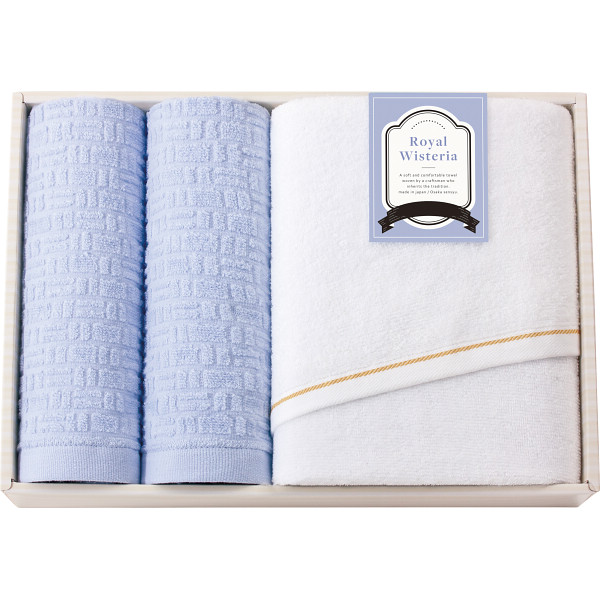●バスタオル(約60×115cm)×1枚・ハンドタオル(約32×34cm)×2枚 ●綿100% ●箱サイズ:38×26×5.5cm ●日本製