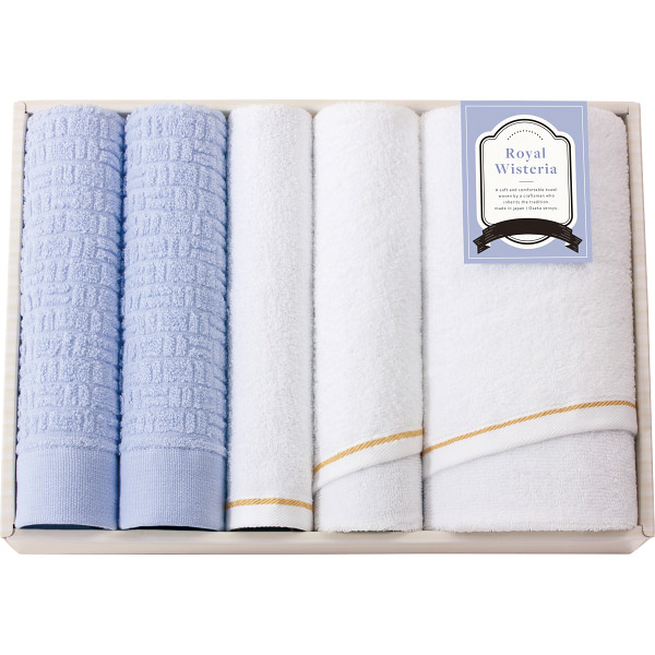 ●バスタオル(約60×115cm)・ハンドタオル(約32×34cm)各1枚・フェイスタオル(約32×75cm)×3枚 ●綿100% ●箱サイズ:38×26×5.5cm ●日本製