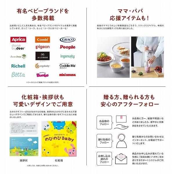 こんなの欲しかった。子育てママ&パパの声から生まれた、出産祝いカタログギフトです。有名ベビーブランドから、がんばるママとパパを応援するアイテムを取り揃えました。