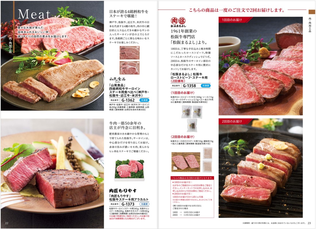 ●ごっつお便券(注文はがき)、カタログ(掲載点数:100点) ※お品物のお申し込み期限は、発行日から1年後の月末日までとなります。 ※カタログ表紙・掲載商品・掲載点数が変更になる場合がございます。