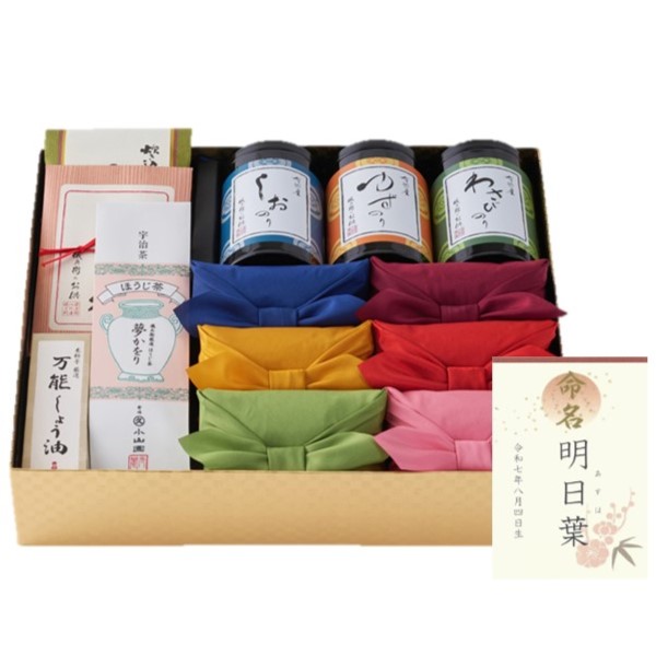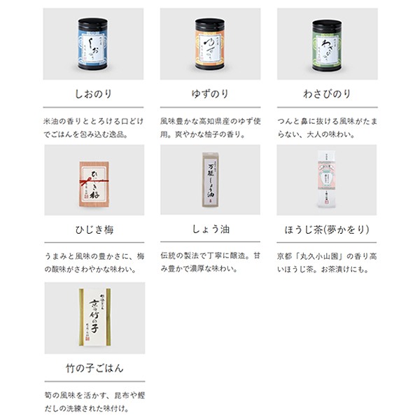 ●料理米2合(300g)6種類(極・結・和・洋・中・健)×各1、のり缶(しお・ゆず・わさび)×各1、佃煮(ひじき梅)×1、醤油×1、竹の子ごはんの素×1、儀兵衛厳選ほうじ茶「夢かをり」×1 ●箱サイズ:30.5×36×8cm ●賞味期限:常温で45日 ●名入れ ※アレルギー物質を含む特定原材料8品目について明記しております。 ※賞味期限は製造・加工日を基準に表記しております。お届け時の期限が配送状況等により異なりますので、あらかじめご了承ください。