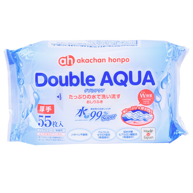 ●当社従来品に比べ、液量は水99%おしりふき厚手タイプに比べて1.4倍、同スタンダードタイプに比べると1.8倍で、水で洗い流すように使える赤ちゃんのおしりふきです。 ●ふきとり性に優れた厚手凹凸不織布を採用しました。 ●”水”にこだわり、超純水※1を99%以上使用しています。 ※1 水の精製技術を駆使して不純物を取り除いた、純度100%の理論上のH2Oに限りなく近い水のこと。 ●防腐剤を必要最小限に抑えた赤ちゃんのおしりふきです。 ●パラベン、プロピレングリコール(PG)は配合していません。 ●お肌にやさしい弱酸性です。 ●パラベン不使用 ●グルコシルセラミド配合(保湿成分) ●加水分解ヒアルロン酸配合(保湿成分) ●ノンアルコール・無香料 ●皮膚刺激性テスト済み(すべての人に皮ふ刺激を起こさないというわけではありません。) ※トイレに流さないでください。