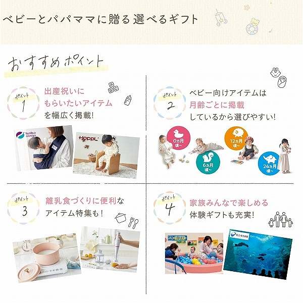 ベビーとパパママに贈る出産祝いの決定版。 お食事・メモリアル・デイリーアイテムなど 子育てをサポートする商品も多数掲載しております。 ※えらんでのお品物のお申し込み期限は、お受け取りから120日となります。 ※手付袋はお付けできません。 ※カタログ表紙・掲載商品・掲載点数が変更になる場合がございます。