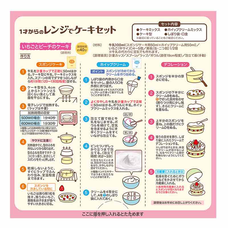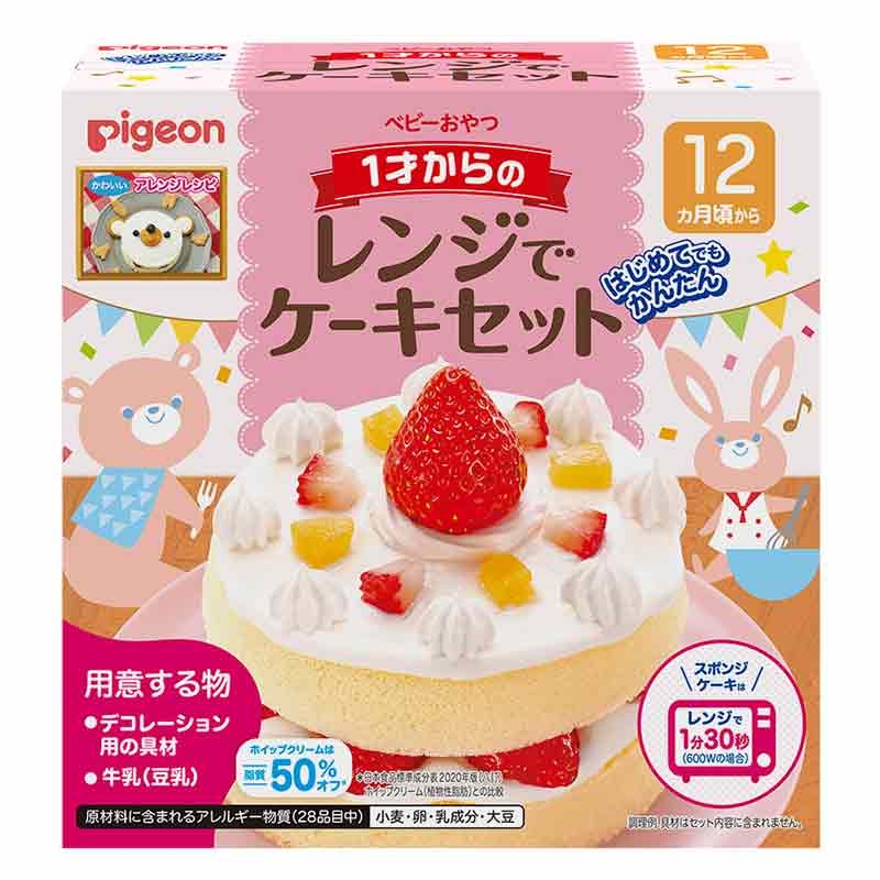1才から食べられる手作りケーキセット。 簡単・短時間で作れ、お子さまと一緒にケーキ作りが楽しめます。 牛乳50mlを入れて混ぜ、電子レンジで90秒加熱(600wの場合)で、スポンジケーキが作れます。 ケーキミックスに、ホイップクリーム粉末、ケーキ型、しぼり袋・口金もセット。すぐ作れます。 甘さ控えめ、ホイップクリームは脂肪分50%カット。 着色料・保存料は使用していません。 ※パッケージリニューアルのため、パッケージデザインが画像と異なる場合がございます。