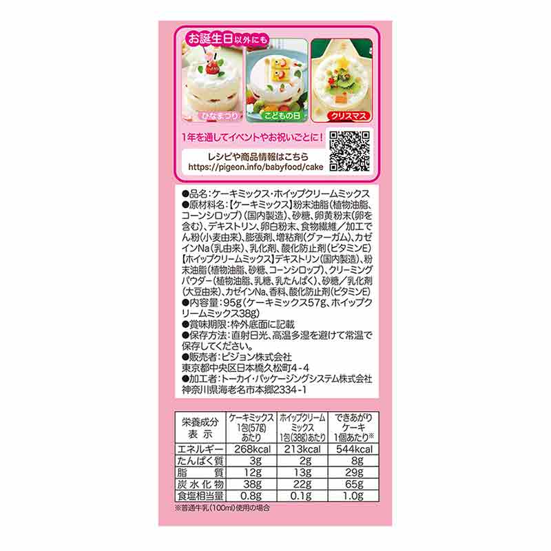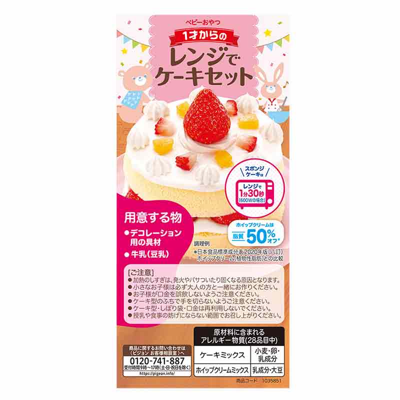 ●1才からのレンジでケーキセット ●原材料名: ・ケーキミックス 植物油脂、糖類(砂糖、コーンシロップ)、卵黄粉末、デキストリン、卵白粉末、食物繊維、加工でん粉、膨張剤、増粘剤(グァー)、香料、酸化防止剤(ビタミンE)、(原材料の一部に小麦、乳成分を含む) ・ホイップクリームミックス デキストリン、植物油脂、糖類(砂糖、コーンシロップ、乳糖)、乳たんぱく、乳化剤、カゼインナトリウム、香料、酸化防止剤(ビタミンE)、(原材料の一部に大豆を含む) ●内容量:95g(ケーキミックス57g、ホイップクリームミックス38g)
