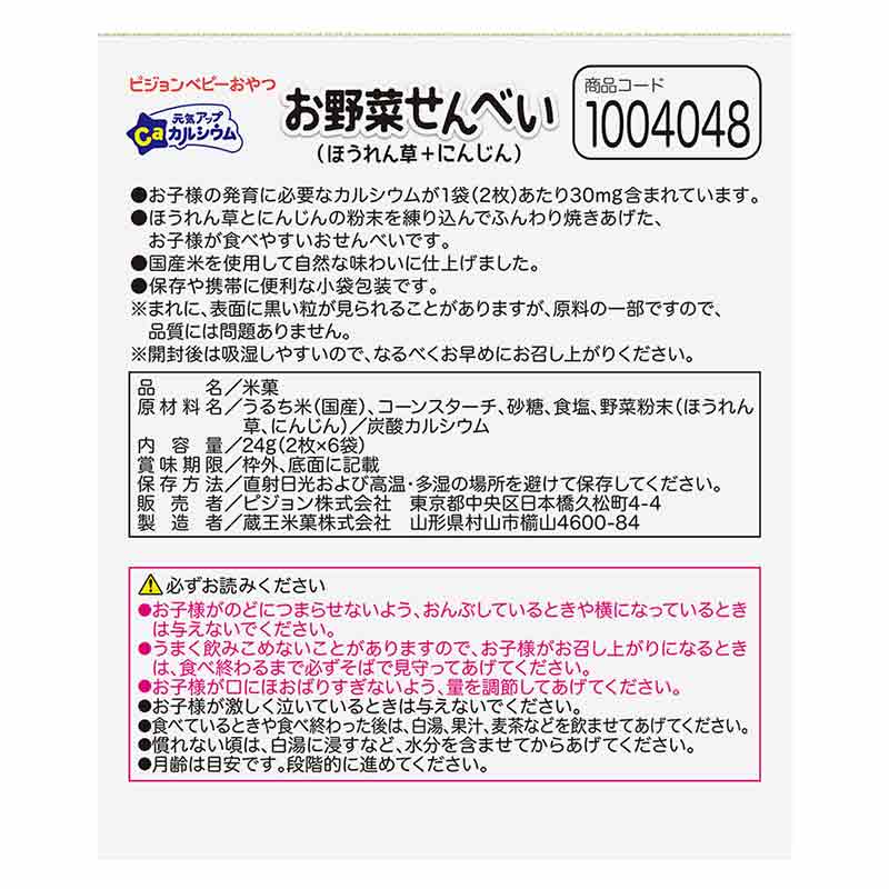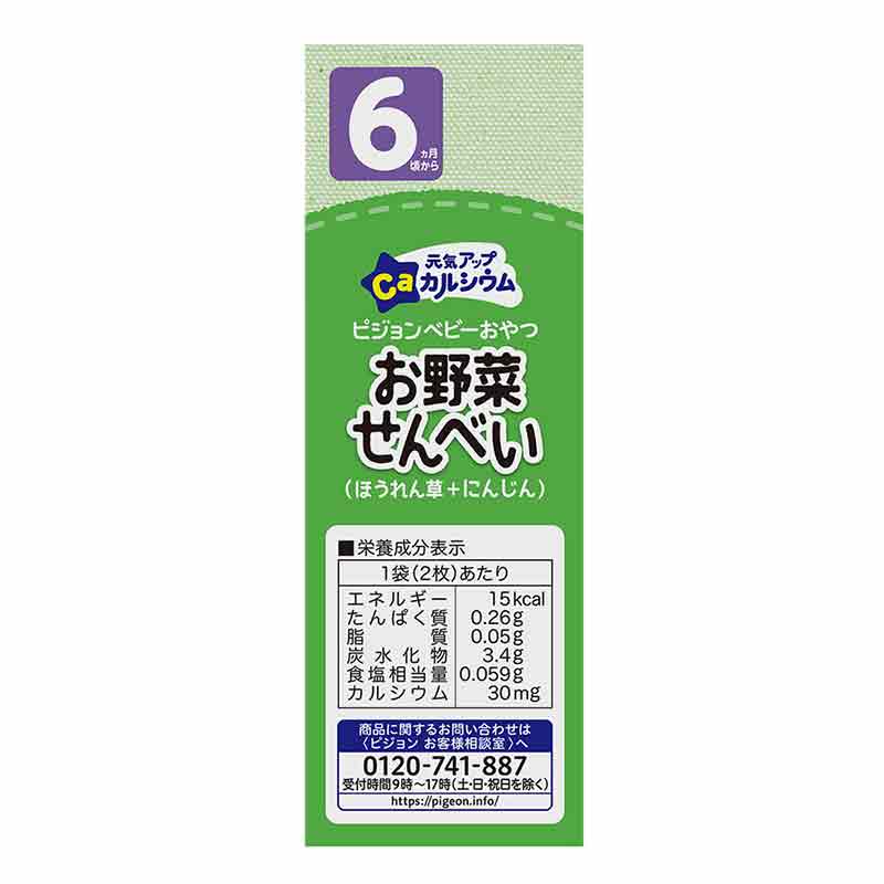 おいしく、楽しく、発育に必要な栄養を補える、ベビーおやつです。 赤ちゃんの手のひらや指先にあわせたサイズ。 手づかみ食べや小さなものを指先でつまむ練習にもぴったりです。 ●赤ちゃんの発育に必要なカルシウムが1袋あたり30mg含まれています。 ●ほうれん草とにんじんの粉末を練り込んでふんわり焼き上げた、赤ちゃんが食べやすいおせんべいです。 ●保存や携帯に便利な小袋包装です。 ●国産米を使用して自然な味わいに仕上げました。 ●着色料・保存料・香料は使用していません。