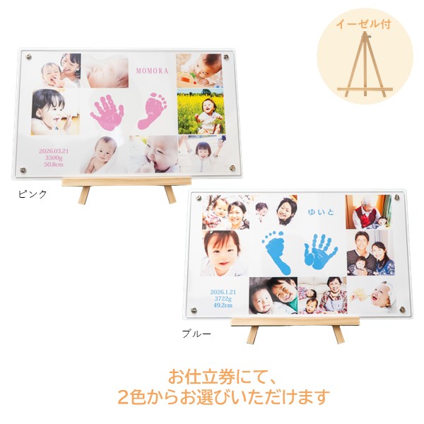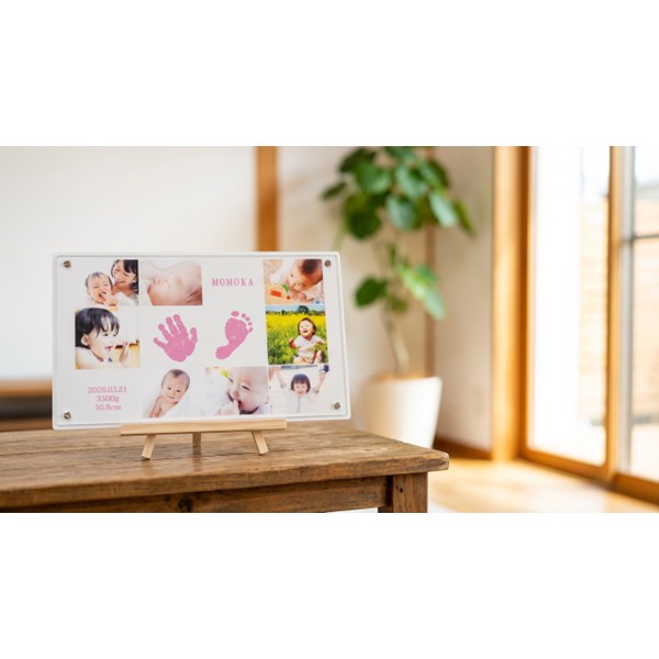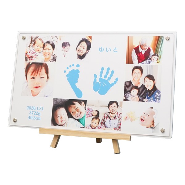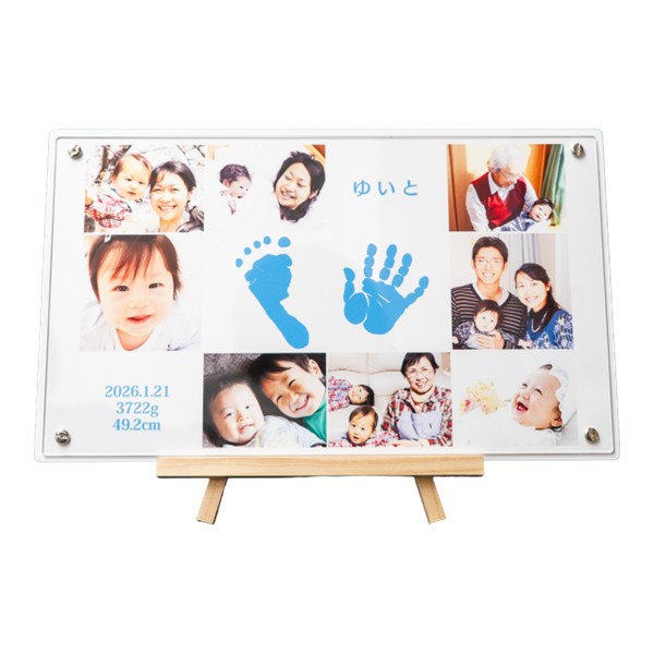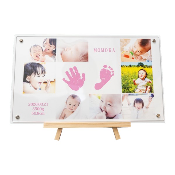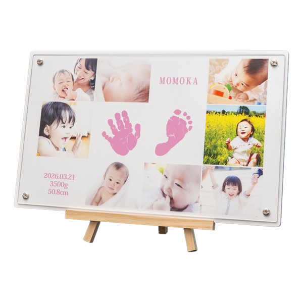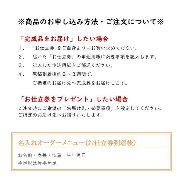 ●セット内容:お申込書1枚(お仕立券)・透明液の手足型キット1セット・「手形・足形」の取り方説明書・返信用封筒×1 ●商品サイズ:現品(仕上がりサイズ)約37×1×22cm・(お仕立て券封筒)約19.8×27.9cm ●材質:繊維板(MDF〈ウレタン塗装〉)アクリル樹脂、スチール ●日本製 ※オーダーメニューは お名前・身長・体重・生年月日。イーゼル付き。 ※商品のお届けは、お仕立券からご注文をお受けして2~3週間です。 ※お写真はメールで送っていただくこともできます。 ※お仕立券を紛失した場合は無効となり再発行はいたしません。